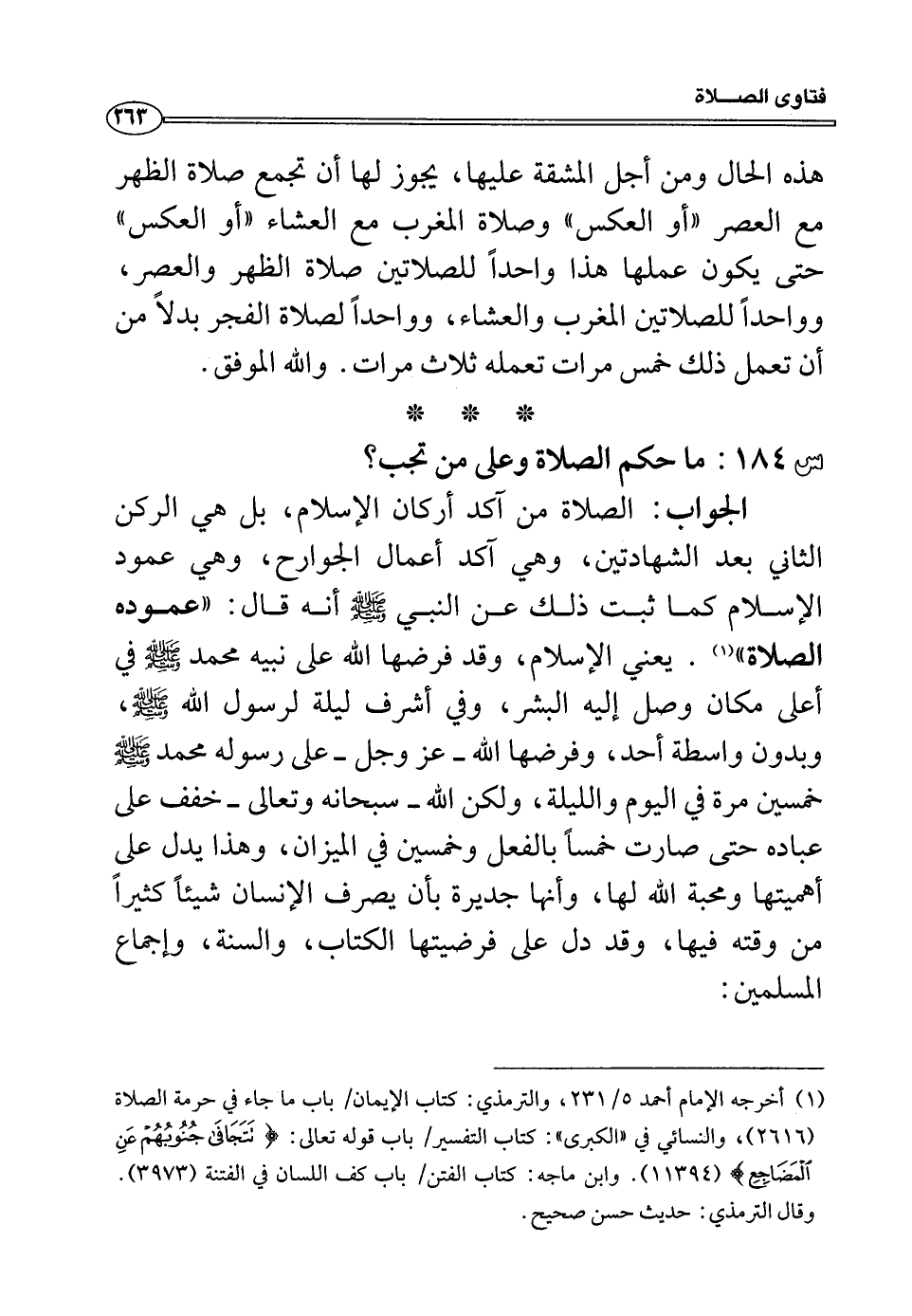 الجواب: الصلاة من آكد أركان الإسلام، بل هي الركن الثاني بعد الشهادتين، وهي آكد أعمال الجوارح، وهي عمود الإسلام كما ثبت ذلك عن النبي صلى الله عليه وسلم أنه قال: ((عموده الصلاة)) (¬1) . يعني الإسلام، وقد فرضها الله على نبيه محمد صلى الله عليه وسلم في أعلى مكان وصل إليه البشر، وفي أشرف ليلة لرسول الله صلى الله عليه وسلم، وبدون واسطة أحد، وفرضها الله -عز وجل- على رسوله محمد صلى الله عليه وسلم خمسين مرة في اليوم والليلة، ولكن الله -سبحانه وتعالى- خفف على عباده حتى صارت خمساً بالفعل وخمسين في الميزان، وهذا يدل على أهميتها ومحبة الله لها، وأنها جديرة بأن يصرف الإنسان شيئاً كثيراً من وقته فيها، وقد دل على فرضيتها الكتاب، والسنة، وإجماع المسلمين: