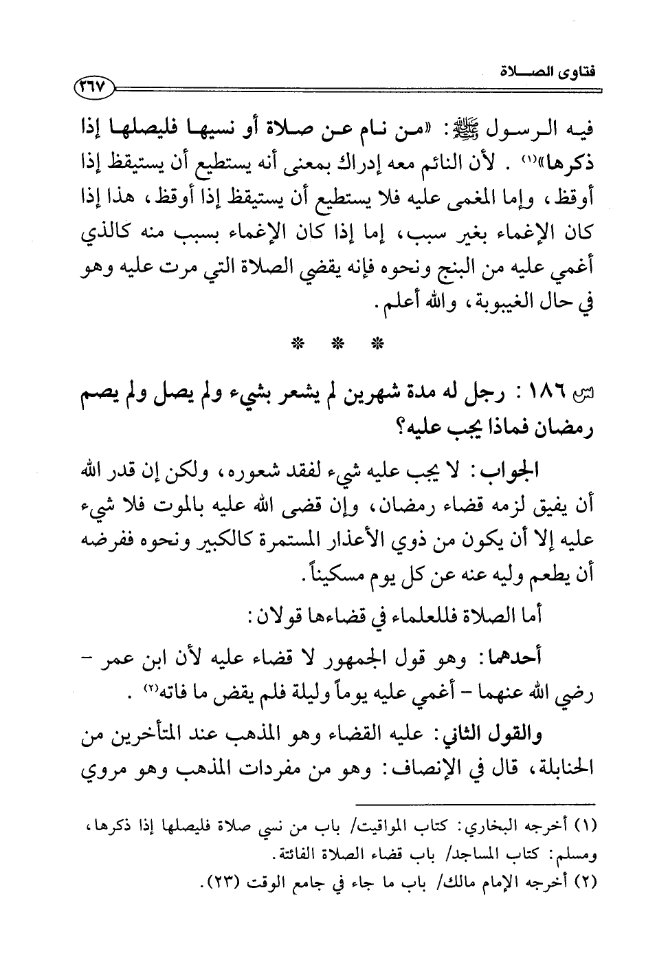 فيه الرسول صلى الله عليه وسلم: "من نام عن صلاة أو نسيها فليصلها إذا ذكرها (¬1) لأن النائم معه إدراك بمعنى أنه يستطيع أن يستيقظ إذا أوقظ، وإما المغمى عليه فلا يستطيع أن يستيقظ إذا أوقظ، هذا إذا كان الإغماء بغير سبب، إما إذا كان الإغماء بسبب منه كالذي أغمي عليه من البنج ونحوه فإنه يقضي الصلاة التي مرت عليه وهو في حال الغيبوبة، والله أعلم.