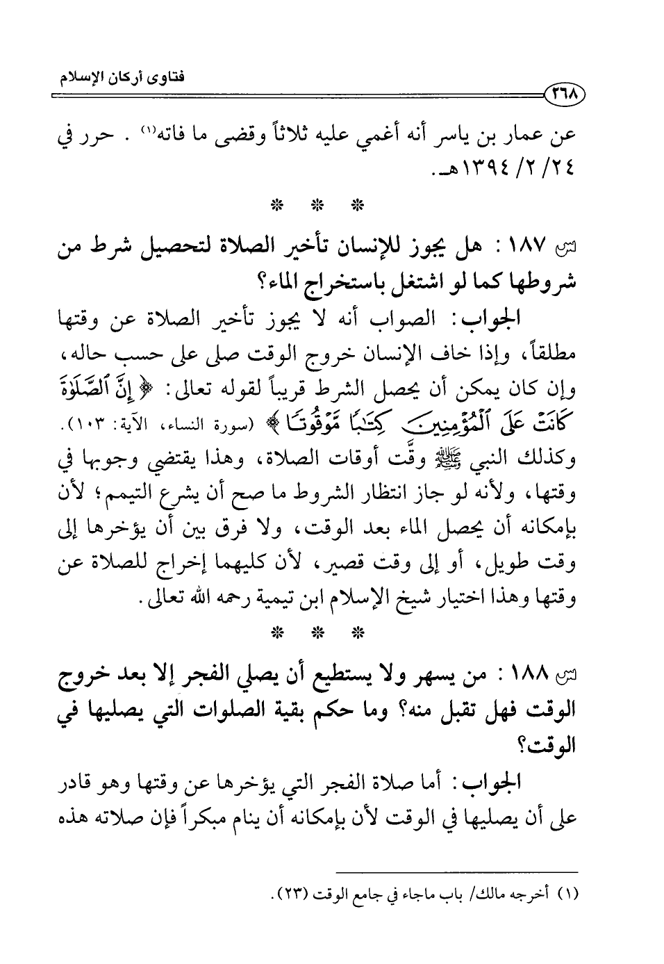 س187: هل يجوز للإنسان تأخير الصلاة لتحصيل شرط من شروطها كما لو اشتغل باستخراج الماء؟