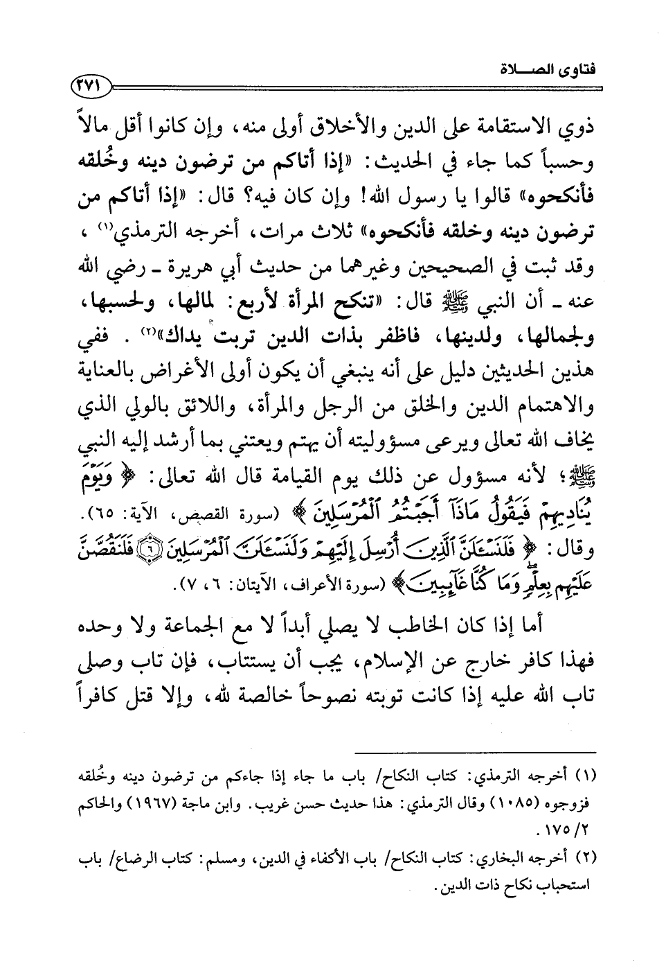 ذوي الاستقامة على الدين والأخلاق أولى منه، وإن كانوا أقل مالاً وحسابً كما جاء في الحديث: ((إذا أتاكم من ترضون دينه وخلقه فانكحوه)) قالوا يا رسول الله! وإن كان فيه؟ قال: ((إذا أتاكم من ترضون دينه وخلقة فانكحوه)) ثلاث مرات، أخرجه الترمذي (¬1) ، وقد ثبت في الصحيحين وغيرهما من حديث أبي هريرة -رضي الله عنه- أن النبي صلى الله عليه وسلم قال: ((تنكح المرأة لأربع: لمالها، ولحسبها، ولجمالها، ولدينها، فاظفر بذات الدين تربت يداك)) (¬2) ففي هذين الحديثين دليل على أنه ينبغي أن يكون أولى الأغراض بالعناية والاهتمام الدين والخلق من الرجل والمرأة، واللائق بالولي الذي يخاف الله تعالى ويرعى مسؤوليته أن يهتم ويعتني بما أرشد إليه النبي صلى الله عليه وسلم، لأنه مسؤول عن ذلك يوم القيامة قال الله تعالى: (وَيَوْمَ يُنَادِيهِمْ فَيَقُولُ مَاذَا أَجَبْتُمُ الْمُرْسَلِينَ) (القصص: 65) وقال: (فَلَنَسْأَلَنَّ الَّذِينَ أُرْسِلَ إِلَيْهِمْ وَلَنَسْأَلَنَّ الْمُرْسَلِينَ) (لأعراف: 6) (فَلَنَقُصَّنَّ عَلَيْهِمْ بِعِلْمٍ وَمَا كُنَّا غَائِبِينَ) (الأعراف: 7) .