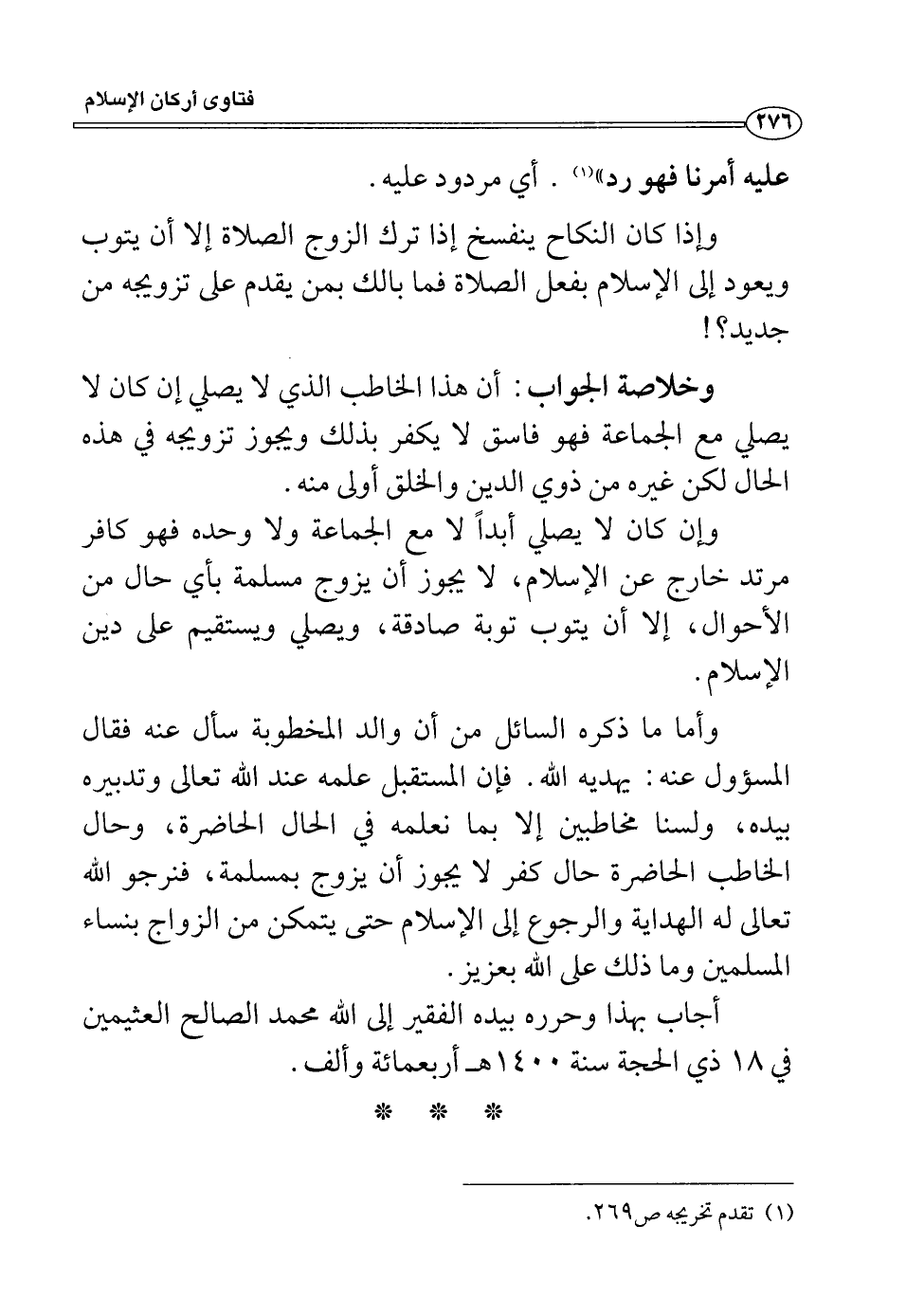 أجاب بهذا وحرره بيده الفقير إلى الله محمد الصالح العثيمين في 18 ذي الحجة سنة 1400هـ أربعمائة وألف.