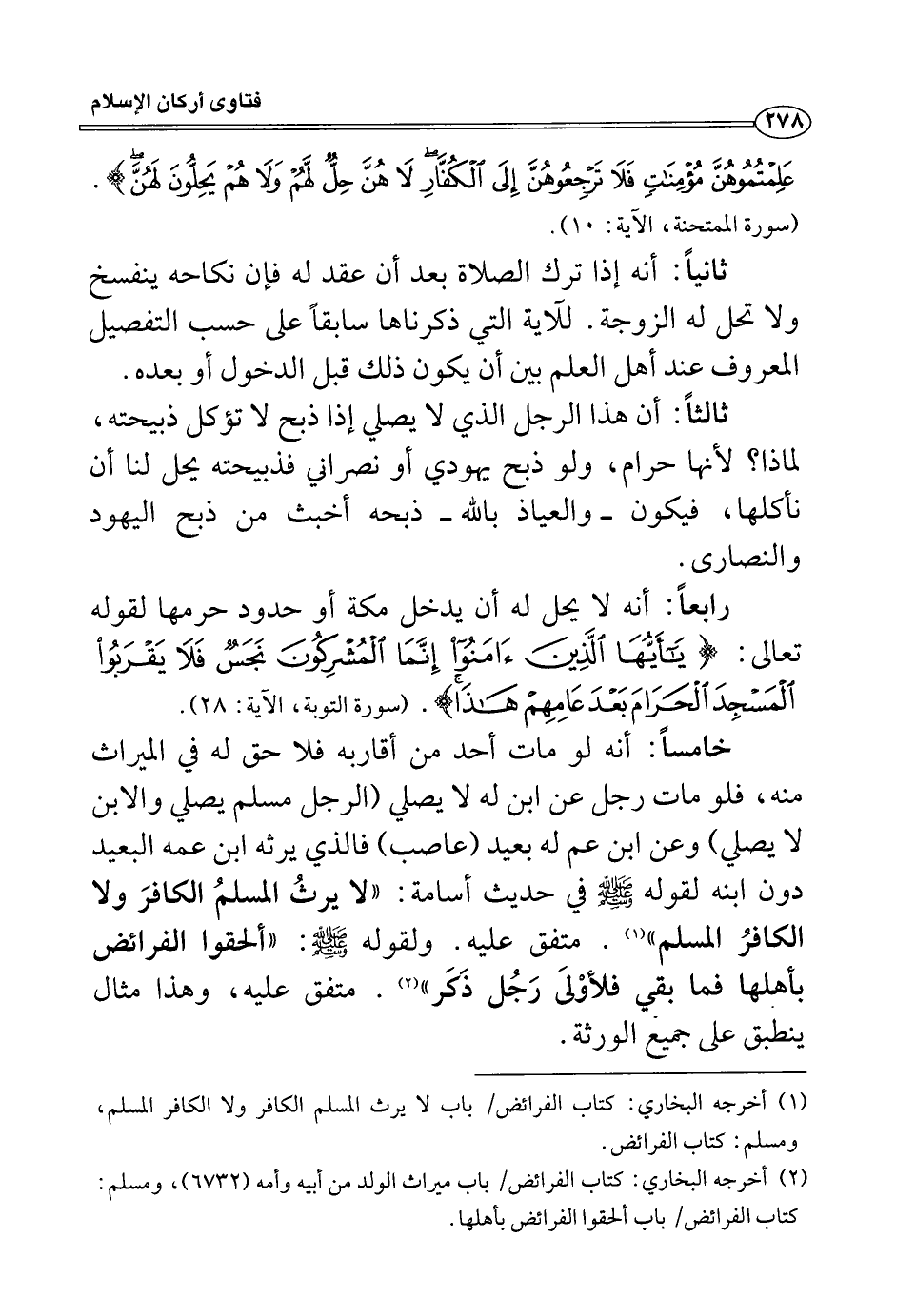 خامساً: أنه لو مات أحد من أقاربه فلا حق له في الميراث منه، فلو مات رجل عن ابن له لا يصلي (الرجل مسلم يصلي والابن لا يصلي) وعن ابن عم له بعيد (عاصب) فالذي يرثه ابن عمه البعيد دون ابنه لقوله صلى الله عليه وسلم في حديث أسامة: ((لا يرث المسلم الكافر ولا الكافر المسلم)) (¬1) متفق عليه. ولقوله صلى الله عليه وسلم: ((ألحقوا الفرائض بأهلها فما بقي فلأولى رجل ذكر)) (¬2) . متفق عليه، وهذا مثال ينطبق على جميع الورثة.