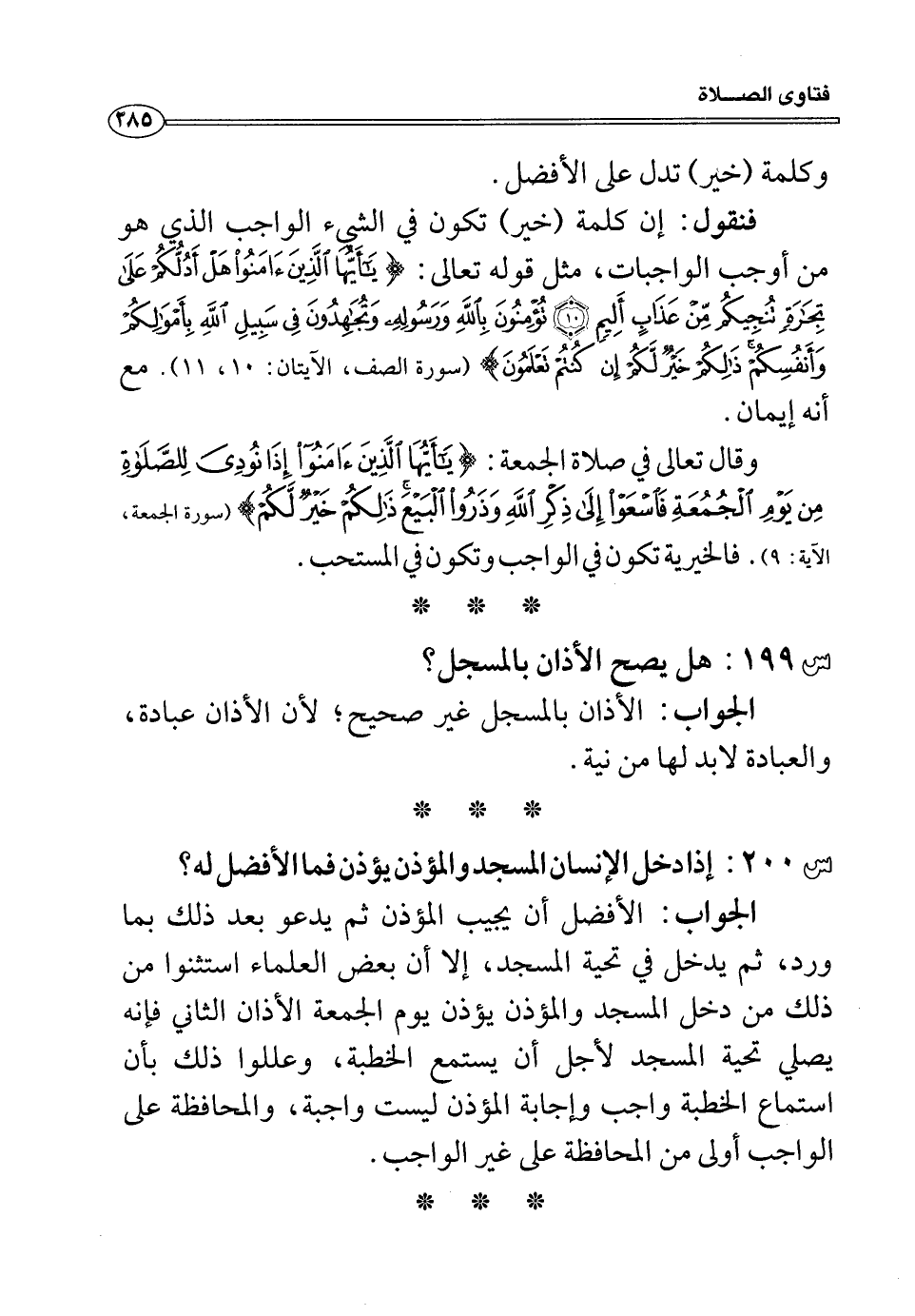 وقال تعالى في صلاة الجمعة: (يَا أَيُّهَا الَّذِينَ آمَنُوا إِذَا نُودِيَ لِلصَّلاةِ مِنْ يَوْمِ الْجُمُعَةِ فَاسَعَوْا إِلَى ذِكْرِ اللَّهِ وَذَرُوا الْبَيْعَ ذَلِكُمْ خَيْرٌ لَكُمْ) (الجمعة: من الآية9) فالخيرية تكون في الواجب وتكون في المستحب.