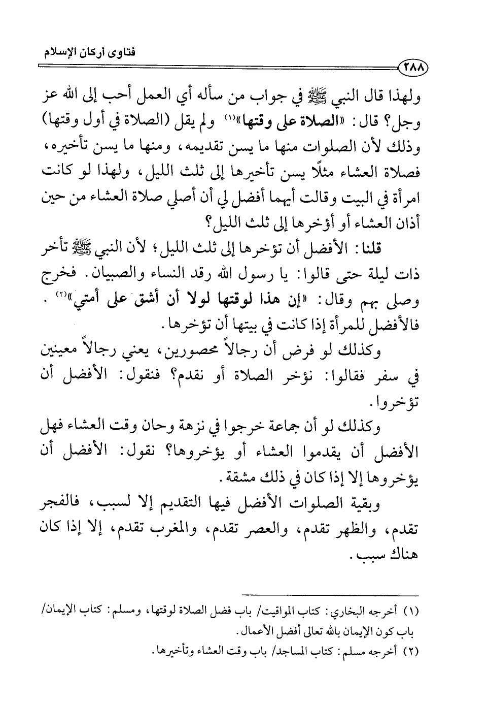 ولهذا قال النبي صلى الله عليه وسلم في جواب من سأله أي العمل أحب إلى الله عز وجل؟ قال: ((الصلاة على وقتها)) (¬1) ولم يقل (الصلاة في أول وقتها) وذلك لأن الصلوات منها ما يسن تقديمه، ومنها ما يسن تأخيره، فصلاة العشاء مثلاً يسن تأخيرها إلى ثلث الليل، ولهذا لو كانت امرأة في البيت وقالت أيهما أفضل لي أن أصلي صلاة العشاء من حين أذان العشاء أو أؤخرها إلى ثلث الليل؟