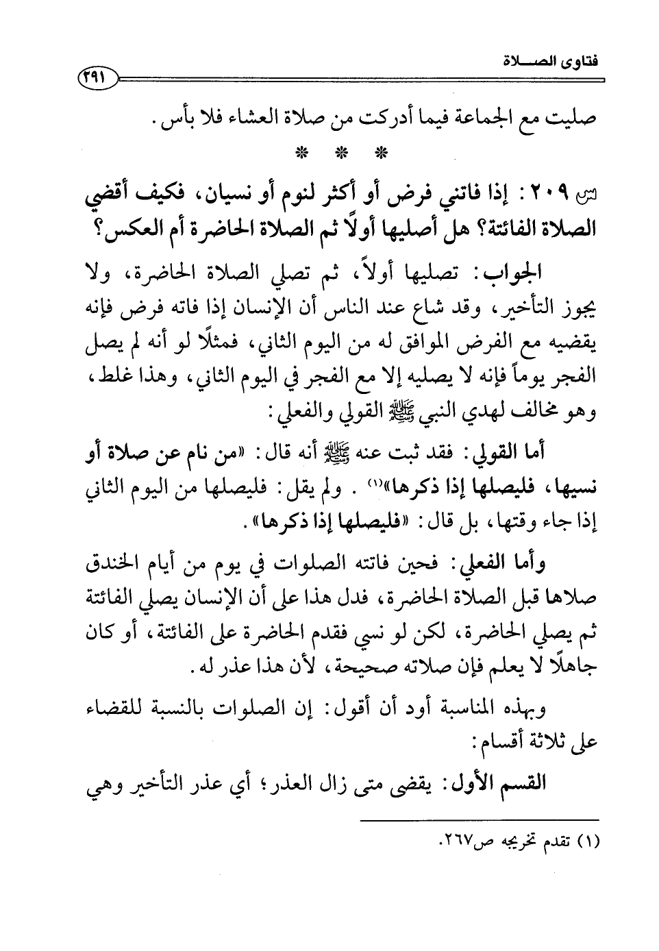 س209: إذا فاتني فرض أو أكثر لنوم أو نسيان، فكيف أقضي الصلاة الفائتة؟ هل أصليها أولاً ثم الصلاة الحاضرة أم العكس؟