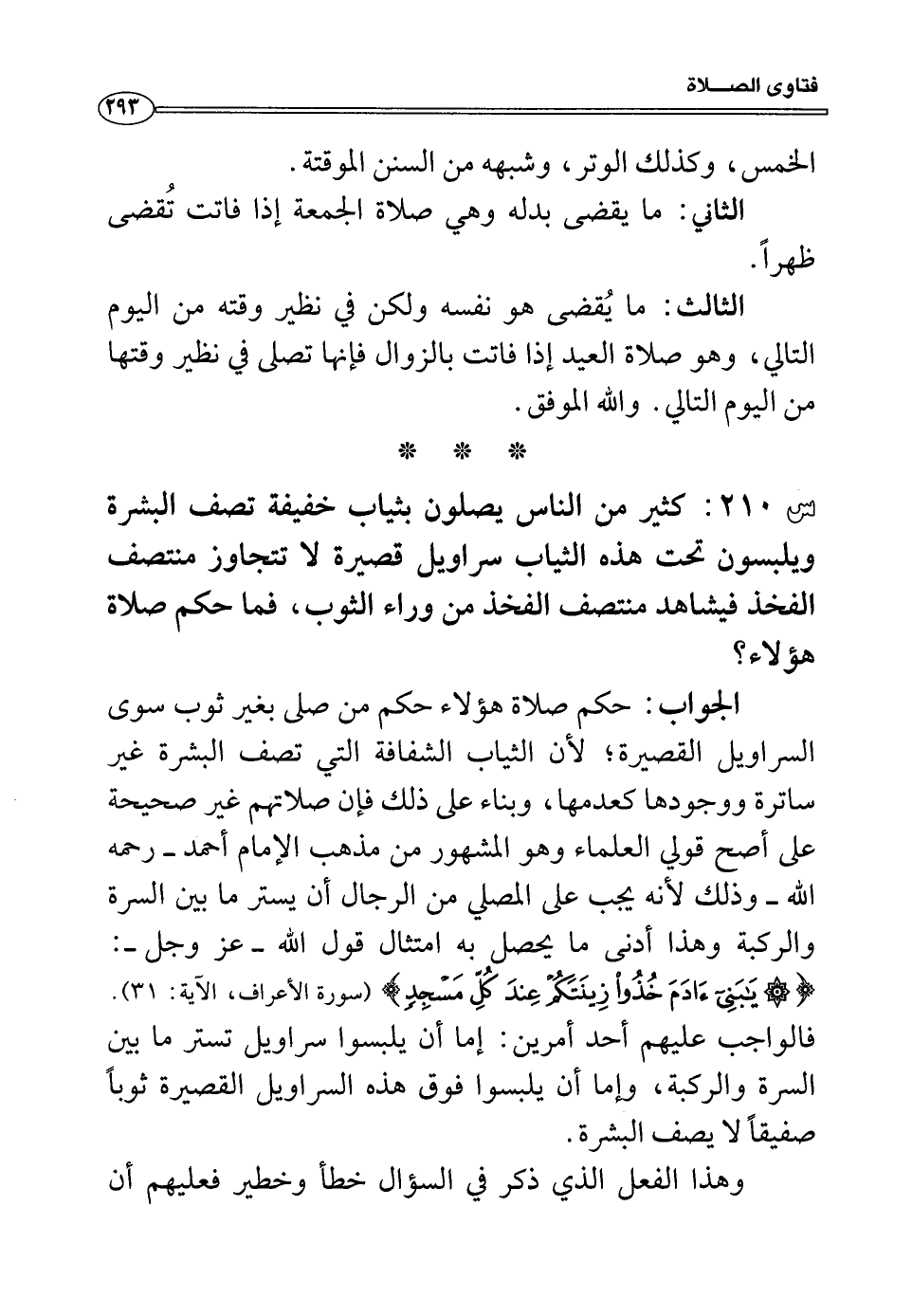 س210: كثير من الناس يصلون بثياب خفيفة تصف البشرة ويلبسون تحت هذه الثياب سراويل قصيرة لا تتجاوز منتصف الفخذ فيشاهد منتصف الفخذ من وراء الثوب، فما حكم صلاة هؤلاء؟