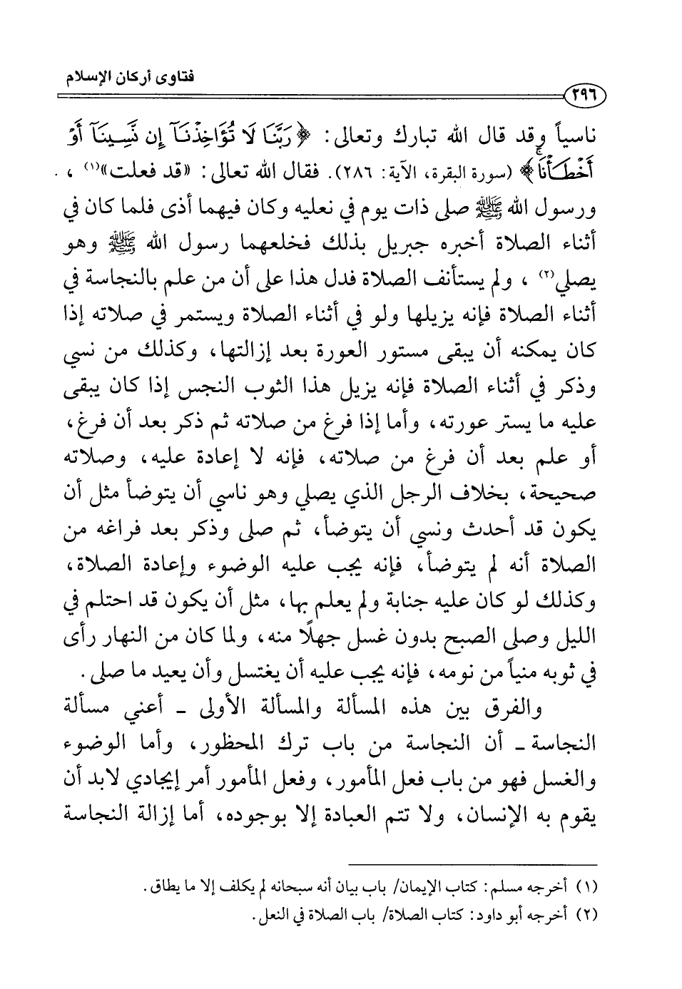 ناسياً وقد قال الله تبارك وتعالى: (رَبَّنَا لا تُؤَاخِذْنَا إِنْ نَسِينَا أَوْ أَخْطَأْنَا) (البقرة: من الآية286) فقال الله تعالى: ((قد فعلت)) (¬1) ، ورسول الله صلى الله عليه وسلم صلى ذات يوم في نعليه وكان فيهما أذى فلما كان في أثناء الصلاة أخبره جبريل بذلك فخلعهما رسول اله صلى الله عليه وسلم وهو يصلي (¬2) ، ولم يستأنف الصلاة فدل هذا على أن من علم بالنجاسة في أثناء الصلاة فإنه يزيلها ولو في أثناء الصلاة ويستمر في صلاته إذا كان يمكنه أن يبقى مستور العورة بعد إزالتها، وكذلك من نسي وذكر في أثناء الصلاة فإنه يزيل هذا الثوب النجس إذا كان يبقى عليه ما يستر عورته، وأما إذا فرغ من صلاته ثم ذكر بعد أن فرغ، أو علم بعد أن فرغ من صلاته، فإنه لا إعادة عليه، وصلاته صحيحة، بخلاف الرجل الذي يصلي وهو ناسي أن يتوضأ مثل أن يكون قد أحدث ونسي أن يتوضأ، ثم صلى وذكر بعد فراغه من الصلاة أنه لم يتوضأ، فإنه يجب عليه الوضوء وإعادة الصلاة، وكذلك لو كان عليه جنابة ولم يعلم بها، مثل أن يكون قد احتلم في الليل وصلى الصبح بدون غُسل جهلاً منه، ولما كان من النهار رأى في ثوبه منياً من نومه، فإنه يجب عليه أن يغتسل وأن يعيد ما صلى.
