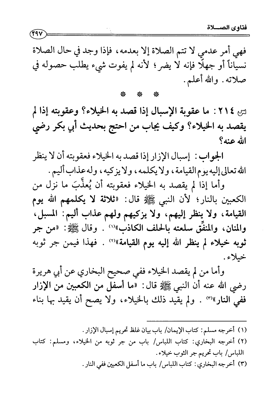 س214: ما عقوبة الإسبال إذ قصد به الخيلاء؟ وعقوبته إذا لم يقصد به الخيلاء؟ وكيف يجاب من احتج بحديث أبي بكر رضي الله عنه؟