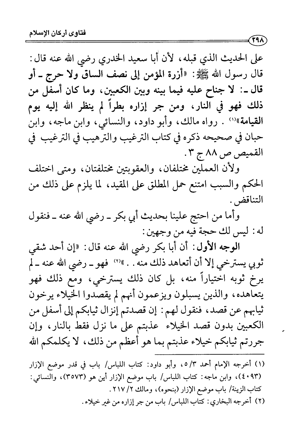الوجه الأول: أن أبا بكر رضي الله عنه قال: ((إن أحد شقي ثوبي يسترخي إلا أن أتعاهد ذلك منه..)) (¬2) فهو -رضي الله عنه- لم يرخ ثوبه اختياراً منه، بل كان ذلك يسترخي، ومع ذلك فهو يتعاهده، والذي يسبلون ويزعمون أنهم لم يقصدوا الخيلاء يرخون ثيابهم عن قصد، فنقول لهم: إن قصدتم إنزال ثيابكم إلى أسفل من الكعبين بدون قصد الخيلاء عذبتم على ما نزل فقط بالنار، وإن جررتم ثيابكم خيلاء عذبتم بما هو أعظم من ذلك، لا يكلمكم الله