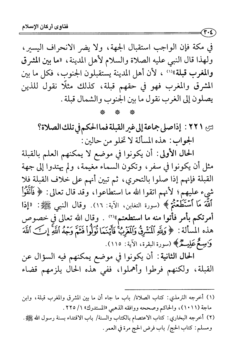 في مكة فإن الواجب استقبال الجهة، ولا يضر الانحراف اليسير، ولهذا قال النبي عليه الصلاة والسلام لأهل المدينة، ((ما بين المشرق والمغرب قبلة)) (¬1) ، لأن أهل المدينة يستقبلون الجنوب، فكل ما بين المشرق والمغرب فهو في حقهم قبلة، كذلك مثلاً نقول للذين يصلون إلى الغرب نقول ما بين الجنوب والشمال قبلة.