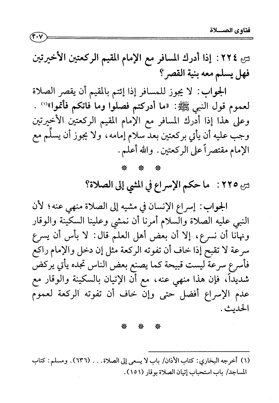 س224: إذا أدرك المسافر مع الإمام المقيم الركعتين الأخيرتين فهل يسلم معه بنية القصر؟