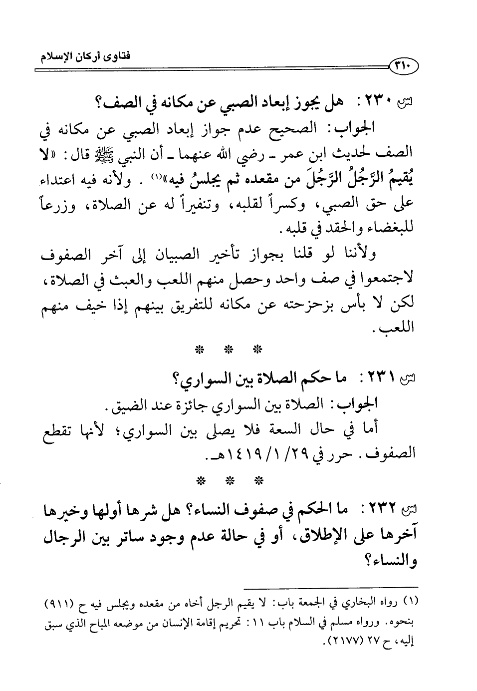 الجواب: الصحيح عدم جواز إبعاد الصبي عن مكانه في الصف لحديث ابن عمر -رضي الله عنهما- أن النبي صلى الله عليه وسلم قال: ((لا يقيم الرجل الرجل من مقعده ثم يجلس فيه)) (¬1) . ولأنه فيه اعتداء على حق الصبي، وكسراً لقلبه، وتنفيراً له عن الصلاة، وزرعاً للبغضاء والحقد في قلبه.