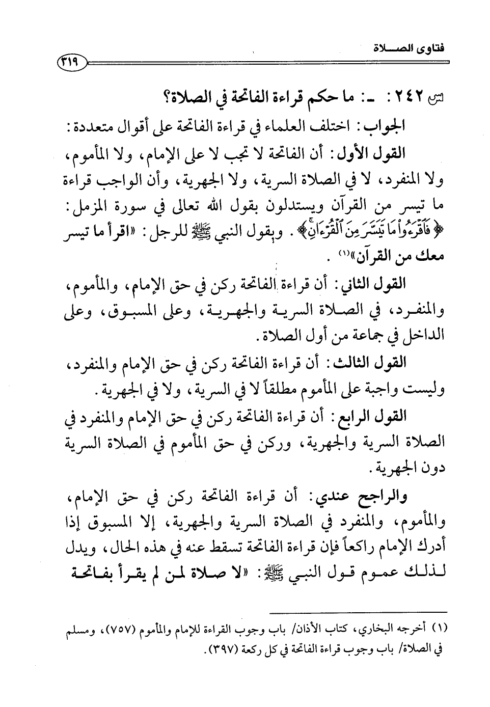 س 242: ما حكم قراءة الفاتحة في الصلاة؟