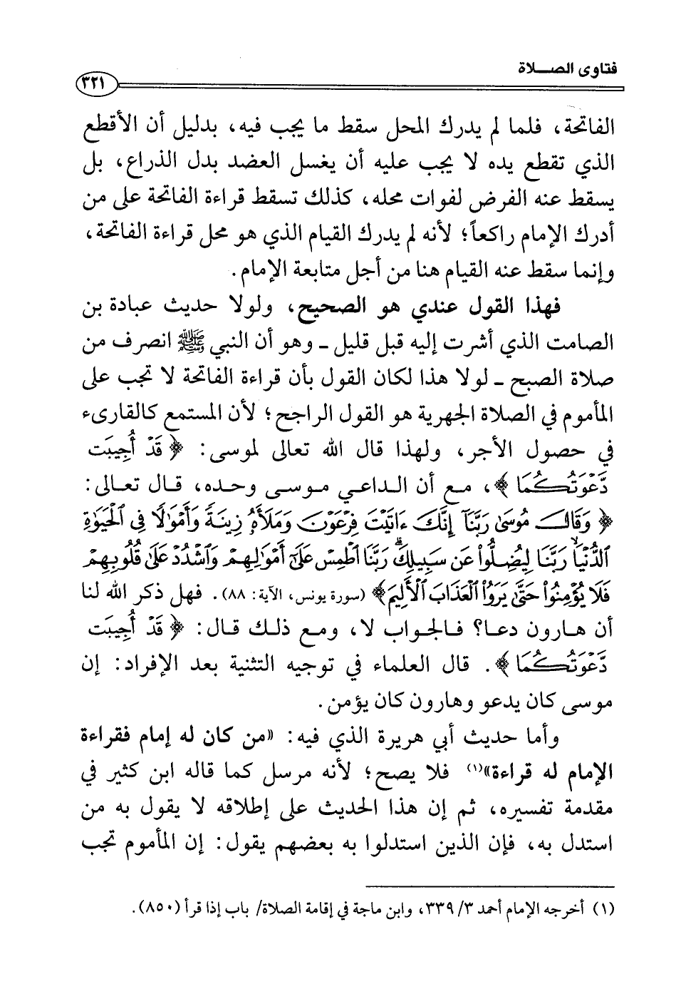 فهذا القول عندي هو الصحيح، ولولا حديث عبادة بن الصامت الذي أشرت إليه قبل قليل - وهو أن النبي صلي الله عليه وسلم انصرف من صلاة الصبح - لولا هذا لكان القول بأن قراءة الفاتحة لا تجب على المأموم في الصلاة الجهرية هو القول الراجح؛ لأن المستمع كالقارىء في حصول الأجر، ولهذا قال الله تعالى لموسى: (قد اجيبت دعوتكما) ، مع أن الداعي موسى وحده، قال تعالى: (وَقَالَ مُوسَى رَبَّنَا إِنَّكَ آتَيْتَ فِرْعَوْنَ وَمَلَأَهُ زِينَةً وَأَمْوَالاً فِي الْحَيَاةِ الدُّنْيَا رَبَّنَا لِيُضِلُّوا عَنْ سَبِيلِكَ رَبَّنَا اطْمِسْ عَلَى أَمْوَالِهِمْ وَاشْدُدْ عَلَى قُلُوبِهِمْ فَلا يُؤْمِنُوا حَتَّى يَرَوُا الْعَذَابَ الْأَلِيمَ) (يونس: 88)