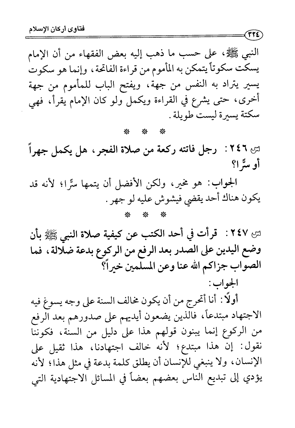 س 247: قرأت في أحد الكتب عن كيفية صلاة النبي صلى الله عليه وسلم بأن وضع اليدين على الصدر بعد الرفع من الركوع بدعة ضلالة، فما الصواب جزاكم الله عنا وعن المسلمين خيراً؟