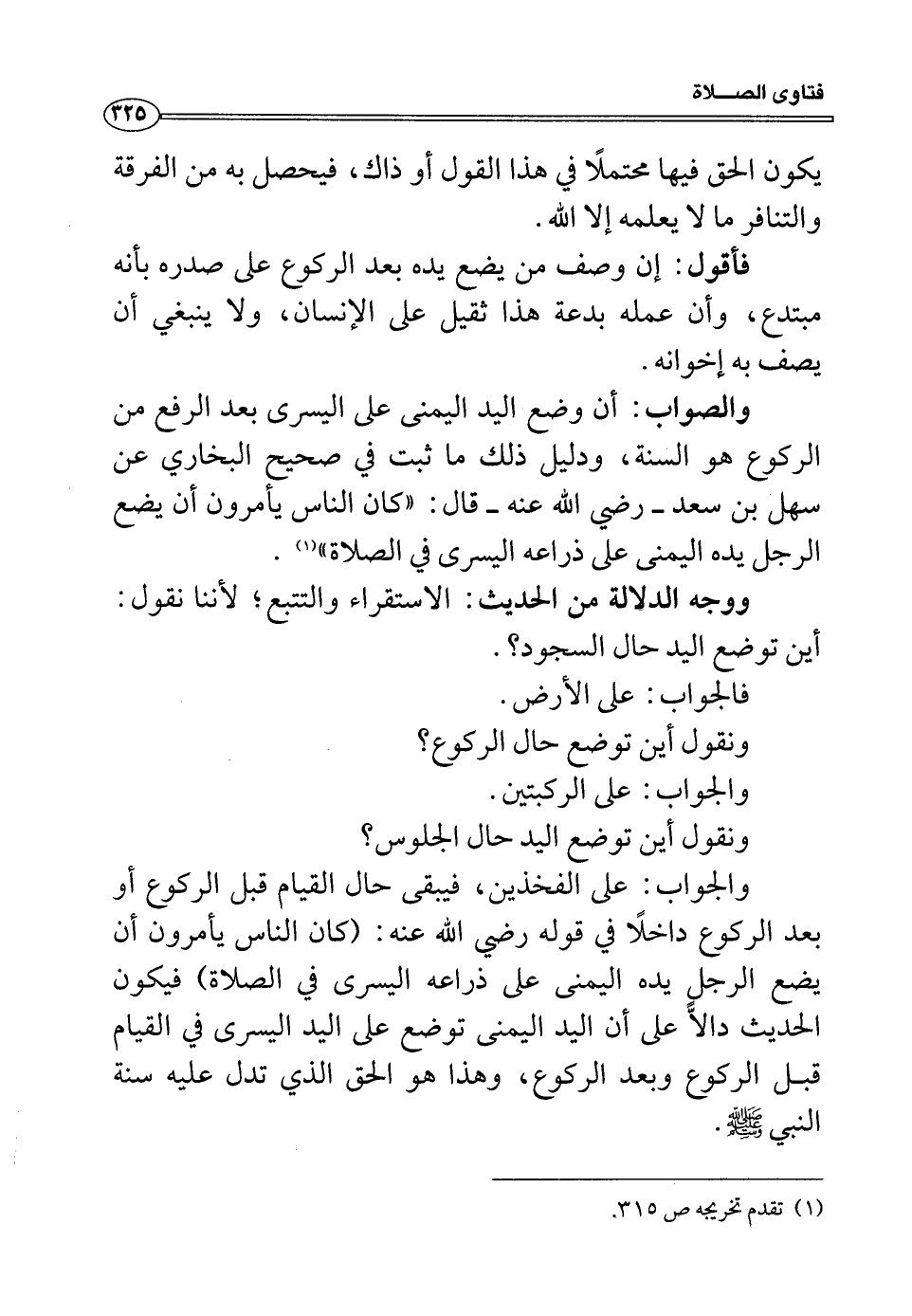 والصواب: أن وضع اليد اليمنى على اليسرى بعد الرفع من الركوع هو السنة، ودليل ذلك ما ثبت في صحيح البخاري عن سهل بن سعد - رضي الله عنه - قال: " كان الناس يأمرون أن يضع الرجل يجده اليمنى على ذراعه اليسرى في الصلاة (¬1) .