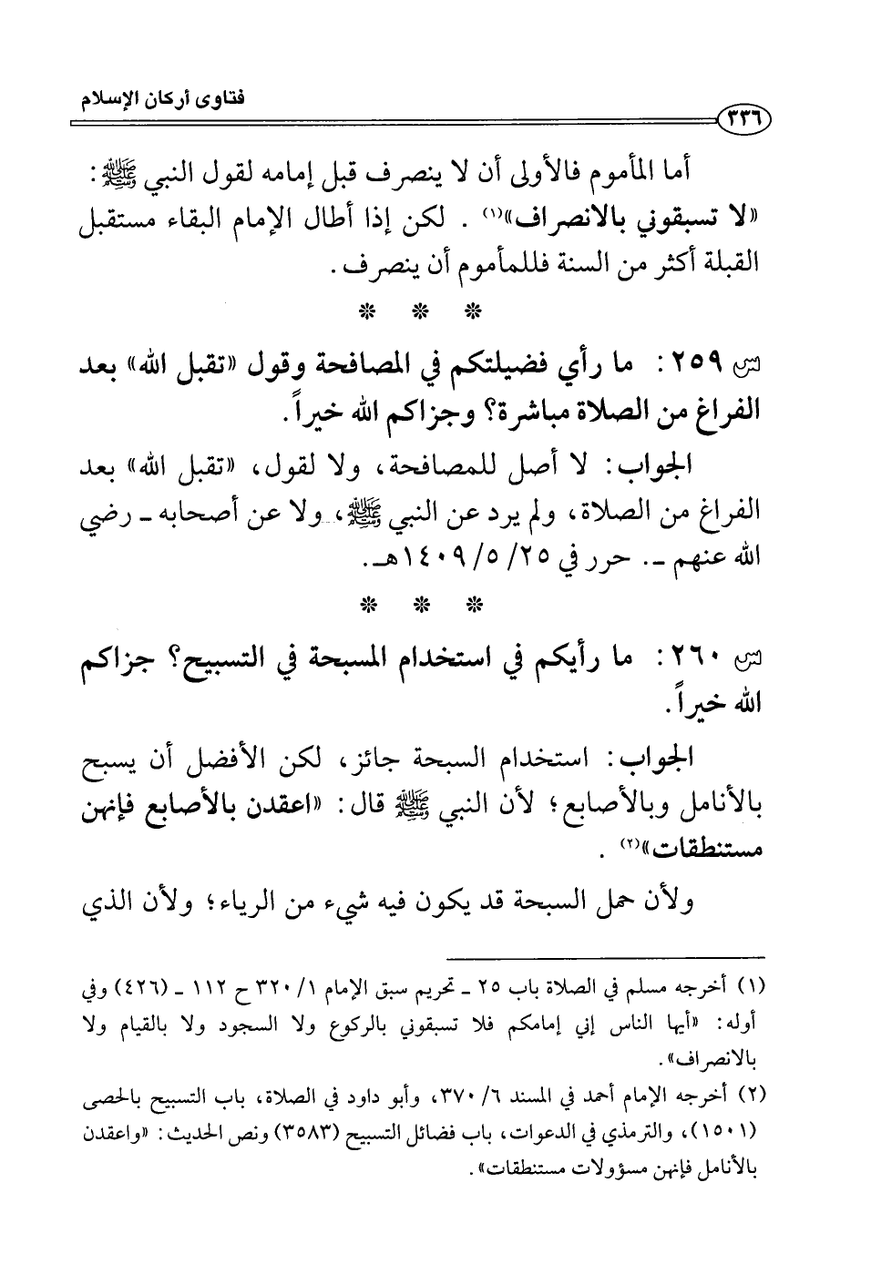 س 259: ما رأي فضيلتكم في المصافحة وقول ((تقبل الله)) بعد الفراغ من الصلاة مباشرة؟ وجزاكم الله خيراً.