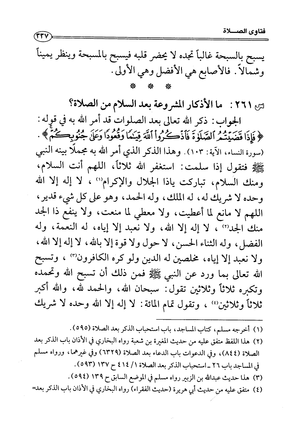 س 261: ما الأذكار المشروعة بعد السلام من الصلاة؟