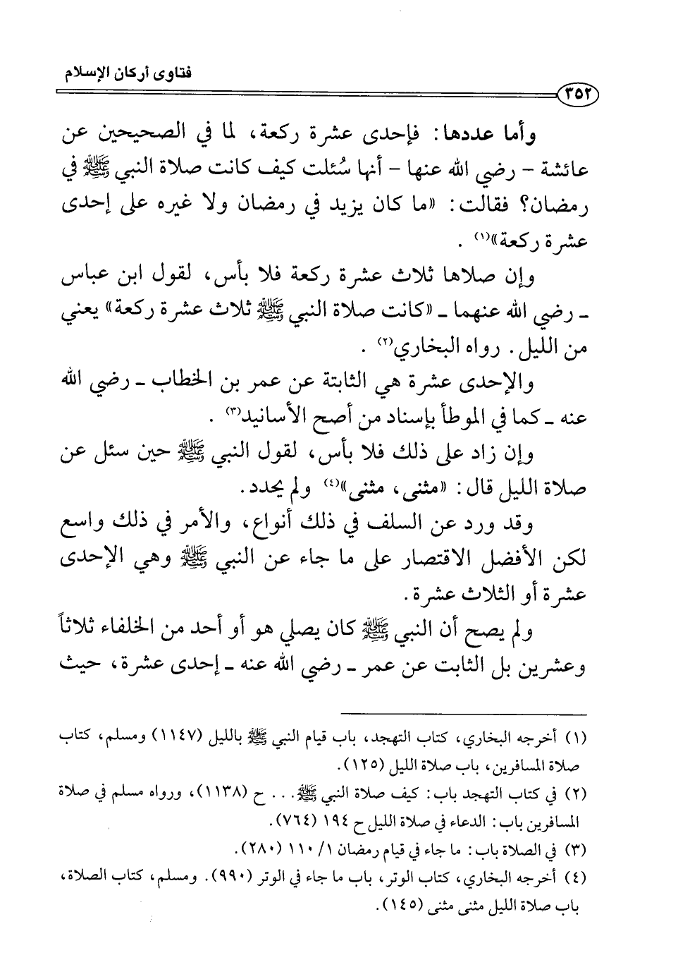 وأما عددها: فإحدى عشرة ركعة، لما في الصحيحين عن عائشة - رضى الله عنها - أنها سُئلت كيف كانت صلاة النبي صلى الله عليه وسلم في رمضان؟ فقالت: " ما كان يزيد في رمضان ولا غيره على إحدى عشرة ركعة (¬1) .
