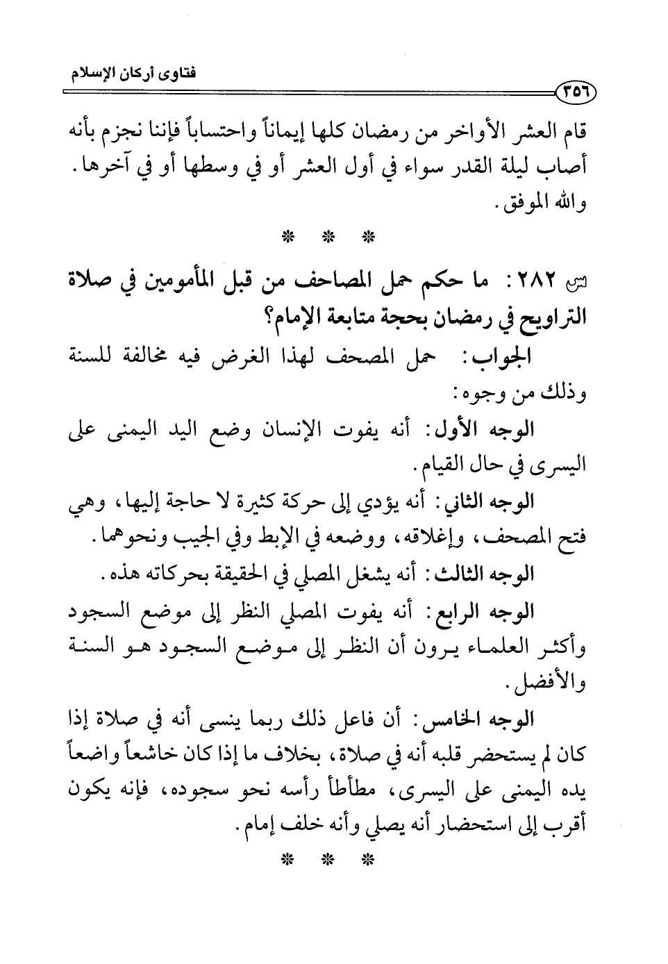 س282: ما حكم حمل المصاحف من قبل المأمومين في صلاة التراويح في رمضان بحجة متابعة الإمام؟