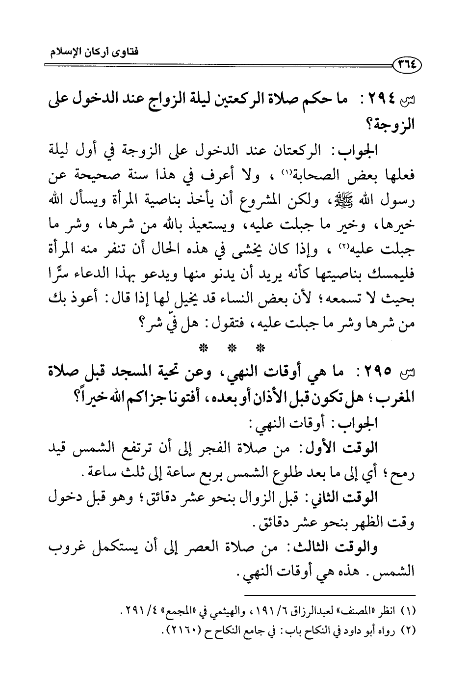 الجواب: الركعتان عند الدخول على الزوجة في أول ليلة فعلها بعض الصحابة (¬1) ، ولا أعرف في هذا سنة صحيحة عن رسول الله صلى الله عليه وسلم، ولكن المشروع أن يأخذ بناصية المرأة ويسأل الله خيرها، وخير ما جبلت عليه، ويستعيذ بالله من شرها وشر ما جبلت عليه (¬2) ، وإذا كان يخشى في هذه الحال أن تنفر منه المرأة فليمسك بناصيتها كأنه يريد أن يدنو منها ويدعو بهذا الدعاء سرَّاً بحيث لا تسمعه؛ لأن بعض النساء قد يخيل لها إذا قال: أعوذ بك من شرها وشر ما جلبت عليه، فتقول: هل فيّ شر؟