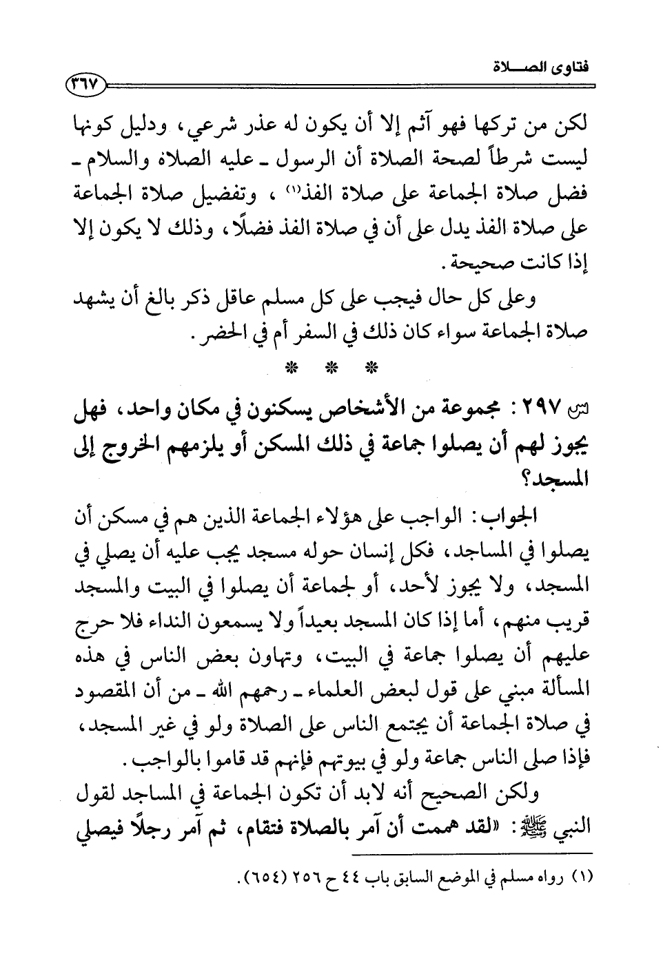س297: مجموعة من الأشخاص يسكنون في مكان واحد، فهل يجوز لهم أن يصلوا جماعة في ذلك المسكن أو يلزمهم الخروج إلى المسجد؟