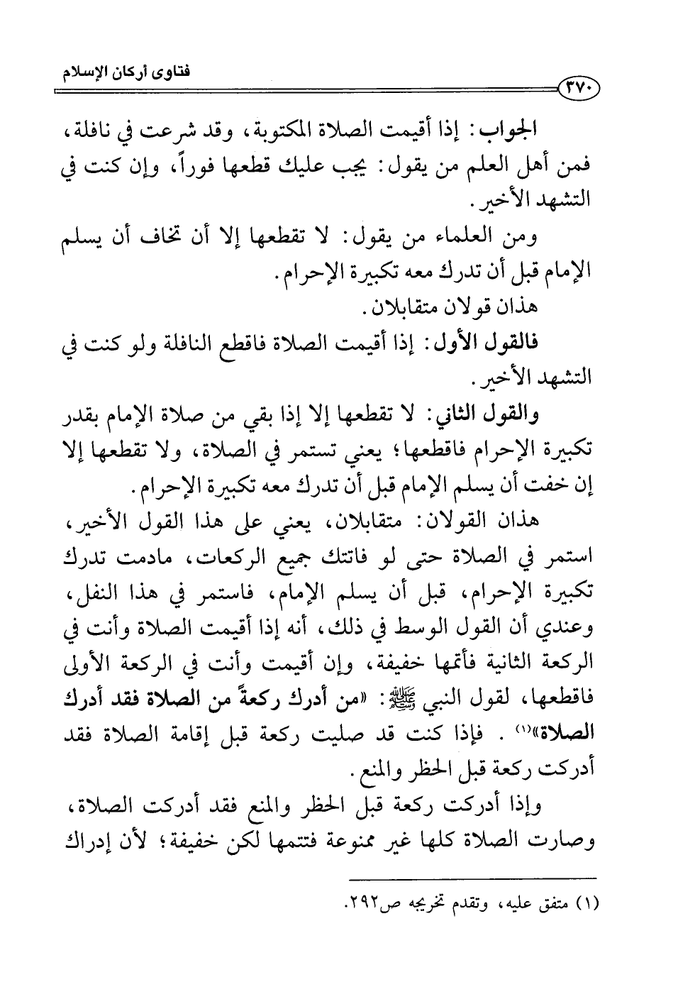 هذان القولان متقابلان، يعني على هذا القول الأخير، استمر في الصلاة حتى لو فاتتك جميع الركعات، مادمت تدرك تكبيرة الإحرام، قبل أن يسلم الإمام، فاستمر في هذا النفل، وعندي أن القول الوسط في ذلك، أنه إذا أقيمت الصلاة وأنت في الركعة الثانية فأتمها خفيفة، وإن أقيمت وأنت في الركعة الأولى فاقطعها، لقول النبي صلى الله عليه وسلم: ((من أدرك ركعةً من الصلاة فقد أردك الصلاة)) (¬1) . فإذا كنت قد صليت ركعة قبل إقامة الصلاة فقد أدركت ركعة قبل الحظر والمنع.