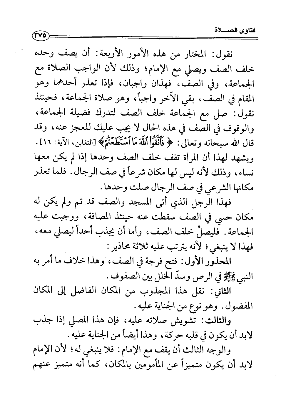 المحذور الأول: فتح فرجة في الصف، وهذا خلاف ما أمر به النبي صلى الله عليه وسلم في الرص وسدّ الخلل بين الصفوف.