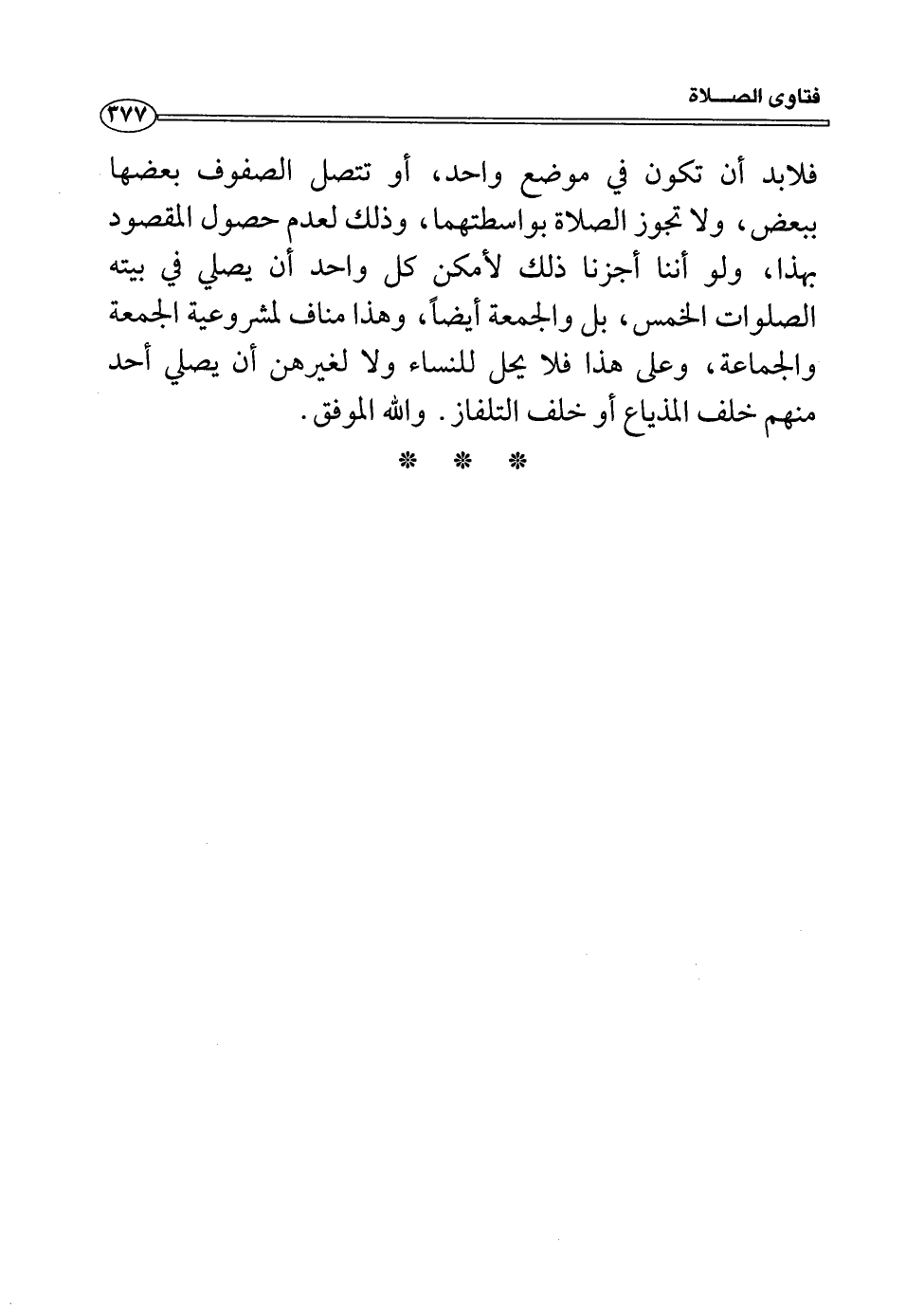 فلابد أن تكون في موضع واحد، أو تتصل الصفوف بعضها ببعض، ولا تجوز الصلاة بواسطتهما، وذلك لعدم حصول المقصور بهذا، ولو أننا أجزنا ذلك لأمكن كل واحد أن يصلي في بيته الصلوات الخمس، بل والجمعة أيضاً، وهذا مناف لمشروعية الجمعة والجماعة، وعلى هذا فلا يحل للنساء ولا لغيرهن أن يصلي أحد منهم خلف المذياع أو خلف التلفاز. والله الموفق.