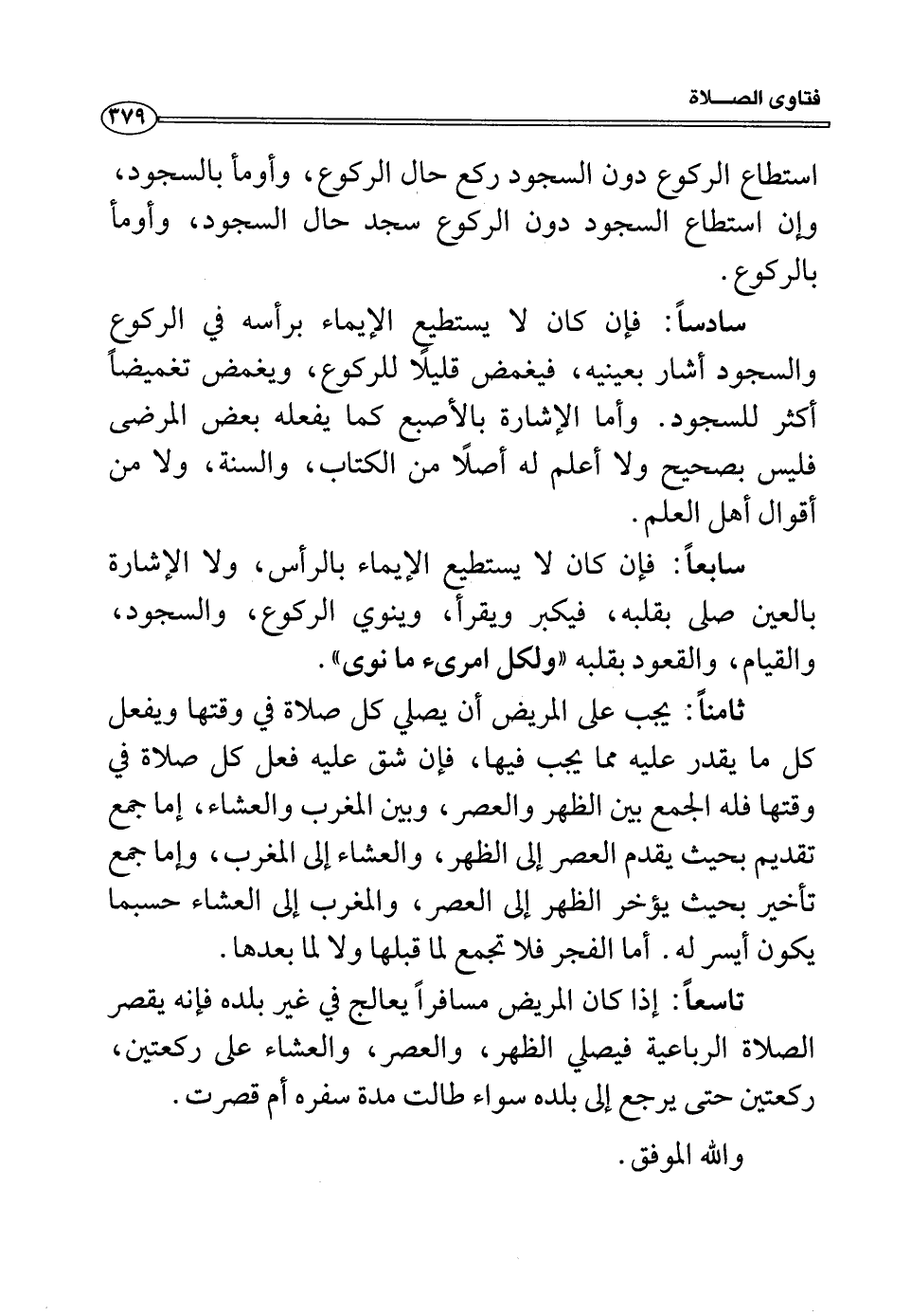 سادساً: فإن كان لا يستطيع الإيماء برأسه في الركوع والسجود أشار بعينيه، فيغمض قليلاً للركوع، ويغمض تغميضاً أكثر للسجود. وأما الإشارة بالأصبع كما يفعله بعض المرضي فليس بصحيح ولا أعمل له أصلاً من الكتاب، والسنة، ولا من أقوال أهل العلم.