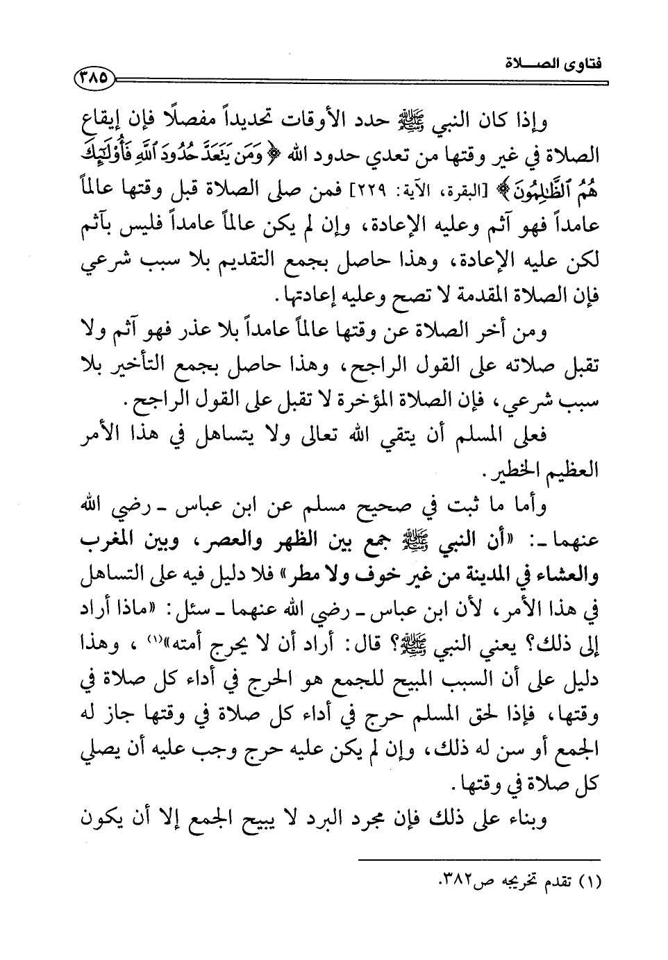 وأما ما ثبت في صحيح مسلم عن ابن عباس - رضى الله عنهما-: ((أن النبي صلى الله عليه وسلم جمع بين الظهر والعصر، وبين المغرب والعشاء في المدينة من غير خوف ولا مطر)) فلا دليل فيه على التساهل في هذا الأمر، لأن ابن عباس- رضي الله عنهما - سئل ((ماذا أراد إلى ذلك؟ يعنى النبي صلى الله عليه وسلم؟ قال أراد أن لا يحرج أمته)) (¬1) ، وهذا دليل على أن السبب المبيح للجمع هو الحرج في أداء كل صلاة في وقتها، فإذا لحق المسلم حرج في أداء كل صلاة في وقتها جاز له الجمع أو سن له ذلك، وإن لم يكن عليه حرج وجب عليه أن يصلي كل صلاة في وقتها.