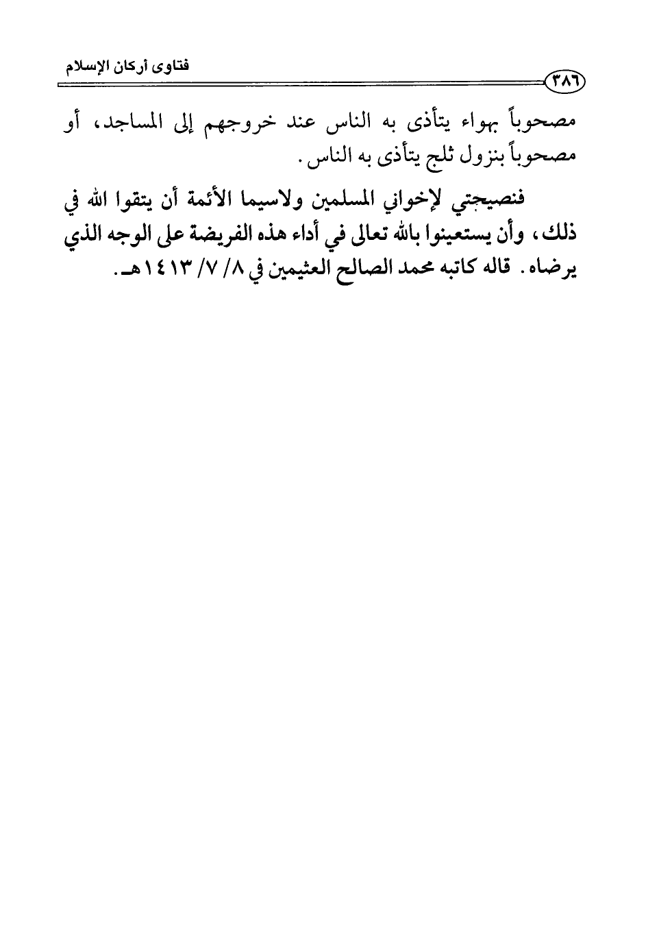 فنصيحتي لإخواني المسلمين ولا سيما الأئمة أن يتقوا الله في ذلك، وأن يستعينوا بالله في أداء هذه الفريضة على الوجه الذي يرضاه. قاله كاتبه محمد الصالح العثيمين في 8/7/1413هـ.