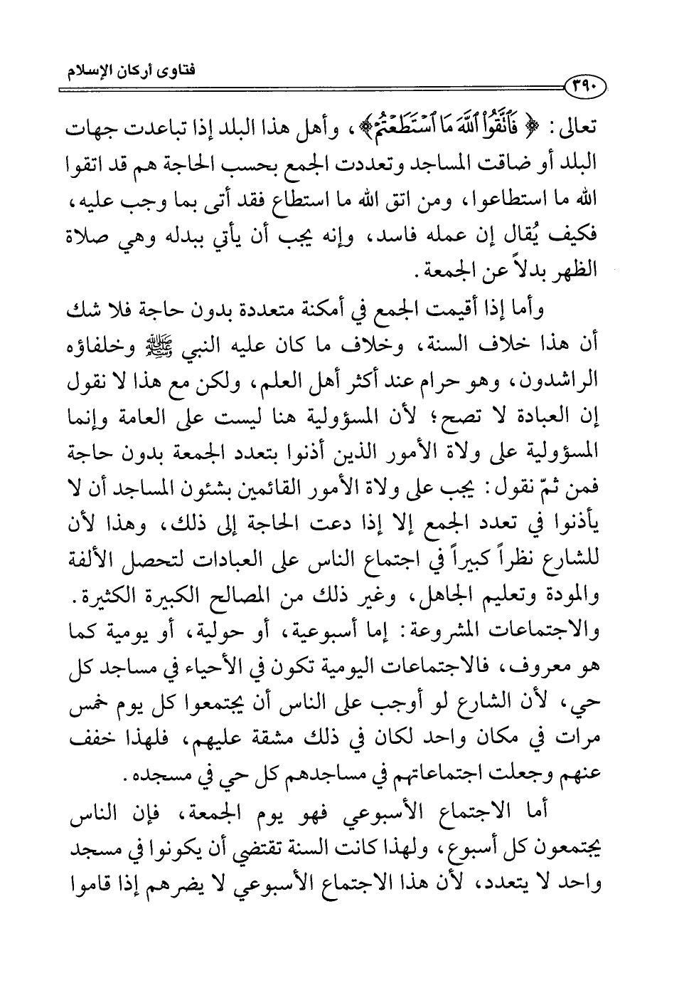 تعالى (فَاتَّقُوا اللَّهَ مَا اسْتَطَعْتُم) ، وأهل هذا البلد إذا تباعدت جهات البلد أو ضاقت المساجد وتعددت الجمع بحسب الحاجة هم قد اتقوا الله ما استطاعوا، ومن اتق الله ما استطاع فقد أتى بما وجب عليه فيكف يُقال إن عمله فاسد، وإنه يجب أن يأتي ببدله وهي صلاة الظهر بدلاً عن الجمعة.
