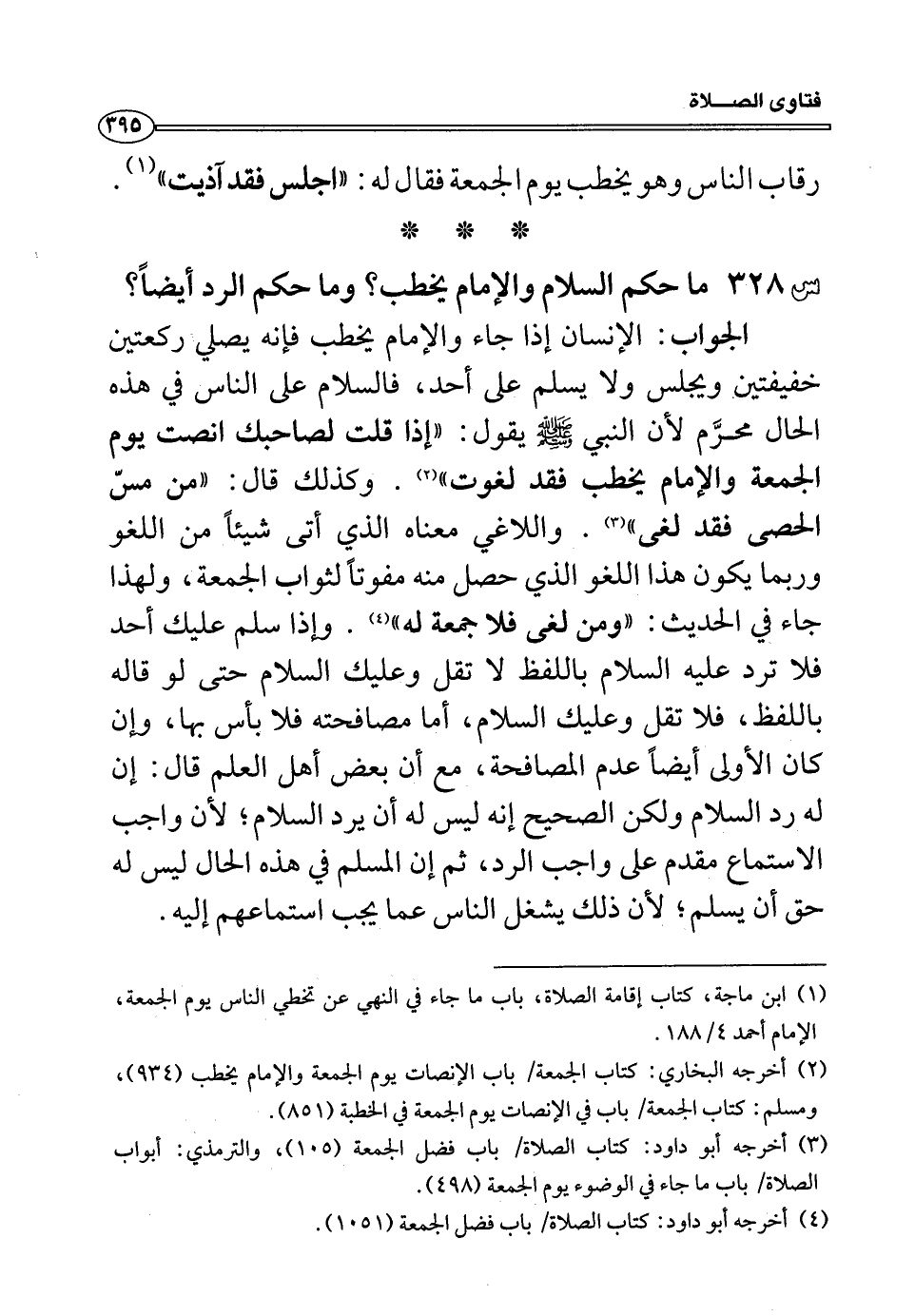 س 328: ما حكم السلام والإمام يخطب؟ وما حكم الرد أيضاً؟