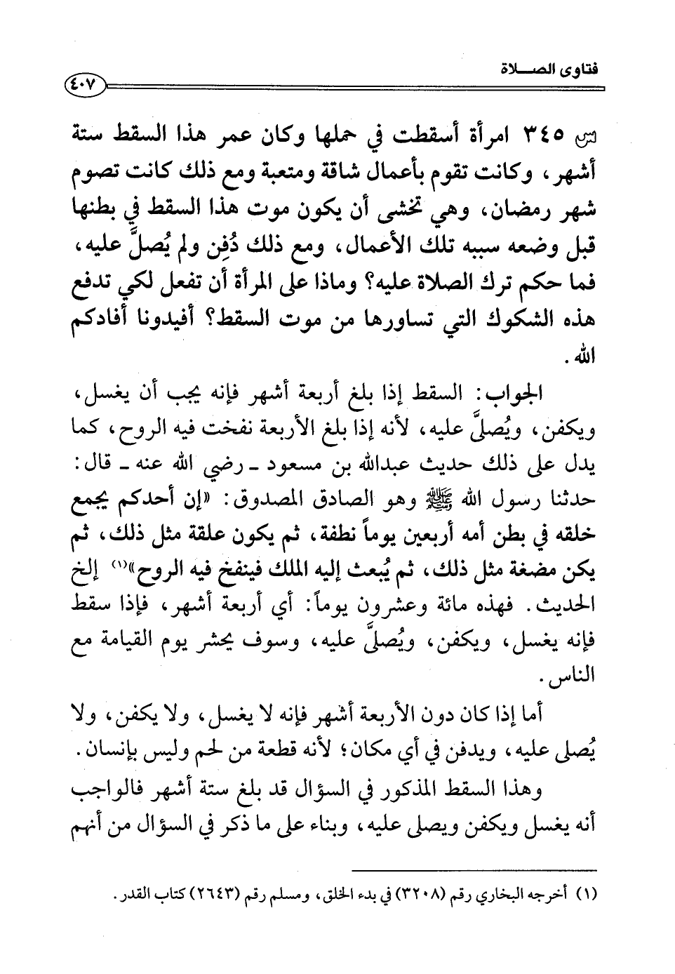 الجواب: السقط إذا بلغ أربعة أشهر فإنه يجب أن يغسل، ويكفن، ويُصلىَّ عليه، لأنه إذا بلغ الأربعة نفخت فيه الروح، كما يدل على ذلك حديث عبد الله بن مسعود - رضى الله عنه - قال: حدثنا رسول الله صلى الله عليه وسلم وهو الصادق المصدوق: ((إن أحدكم يجمع خلقه في بطن أمه أربعين يوماً نطفة، ثم يكون علقة مثل ذلك، ثم يكن مضغة مثل ذلك، ثم يُبعث إليه الملك فينفخ فيه الروح)) (¬1) إلخ الحديث. فهذه مائة وعشرون يوماً: أي أربعة أشهر، فإذا سقط فإنه يغسل، ويكفن، ويُصلَّى عليه، وسوف يحشر يم القيامة مع الناس.