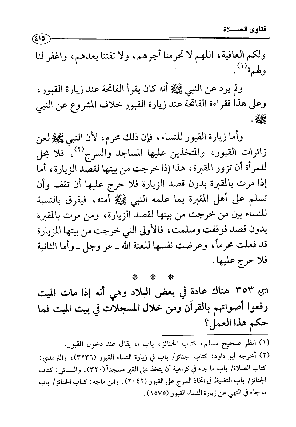 (¬2) أخرجه أبو داود: كتاب الجنائز/ باب في زيارة النساء القبور (3236) ، والترمذي: كتاب الصلاة/ باب ما جاء في كراهية أن يتخذ على القبر مسجداً (320) . والنسائي: كتاب الجنائز/ باب التغليظ في اتخاذ السرج على القبور (2042) . وابن ماجه: كتاب الجنائز باب ما جاء في النهي عن زيارة النساء القبور (1575) .