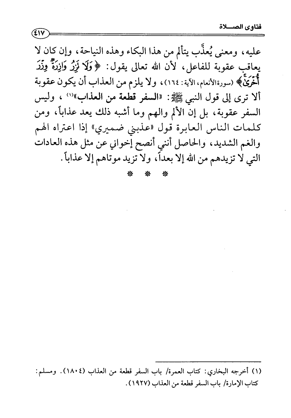 (¬1) أخرجه البخاري: كتاب العمرة/ باب السفر قطعة من العذاب (1804) . ومسلم: كتاب الإمارة/ باب السفر قطعة من العذاب (1927) .