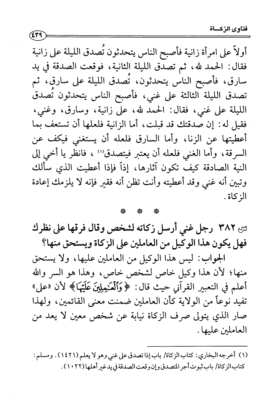 أولاً على امرأة زانية فأصبح الناس يتحدثون تُصدق الليلة على زانية فقال: الحمد لله، ثم تصدق الليلة الثانية، فوقعت الصدقة في يد سارق، فاصبح الناس يتحدثون، تُصدق الليلة على سارق، ثم تصدق الليلة الثالثة على غني، فأصبح الناس يتحدثون تُصدق الليلة على غني، فقال: الحمد لله، على زانية، وسارق، وغني، فقيل له: إن صدقتك قد قبلت، أما الزانية فلعلها أن تستعف بما أعطيتها عن الزنا، وأما السارق فلعله أن يستغني فيكف عن السرقة، وأما الغني فلعله أن يعتبر فيتصدق (¬1) ، فانظر يا أخي إلى النية الصادقة كيف تكون آثارها، إذا فإذا أعطيت الذي سألك وتبين أنه غني وقد أعطيته وأنت تظن أنه فقير فإنه لا يلزمك إعادة الزكاة.