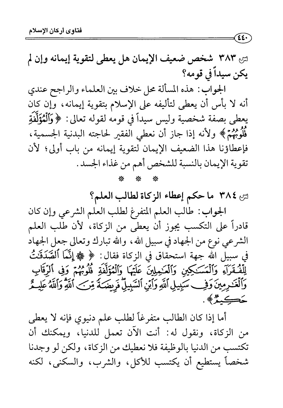 س383: شخص ضعيف الإيمان هل يعطى لتقوية إيمانه وإن لم يكن سيداً في قومه؟