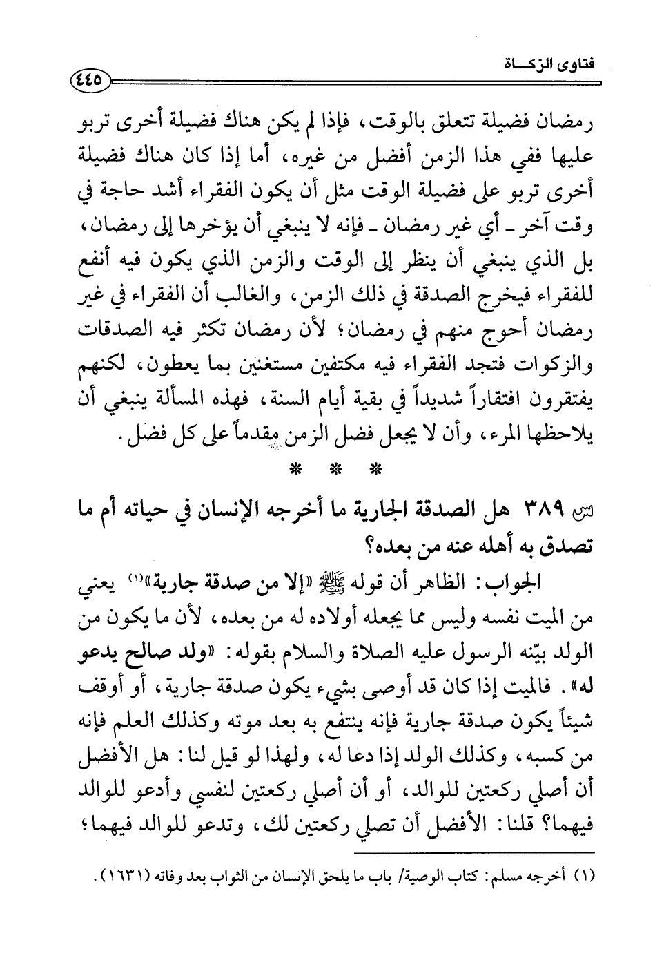 س389: هل الصدقة الجارية ما أخرجه الإنسان في حياته أم ما تصدق به أهله عنه من بعده؟