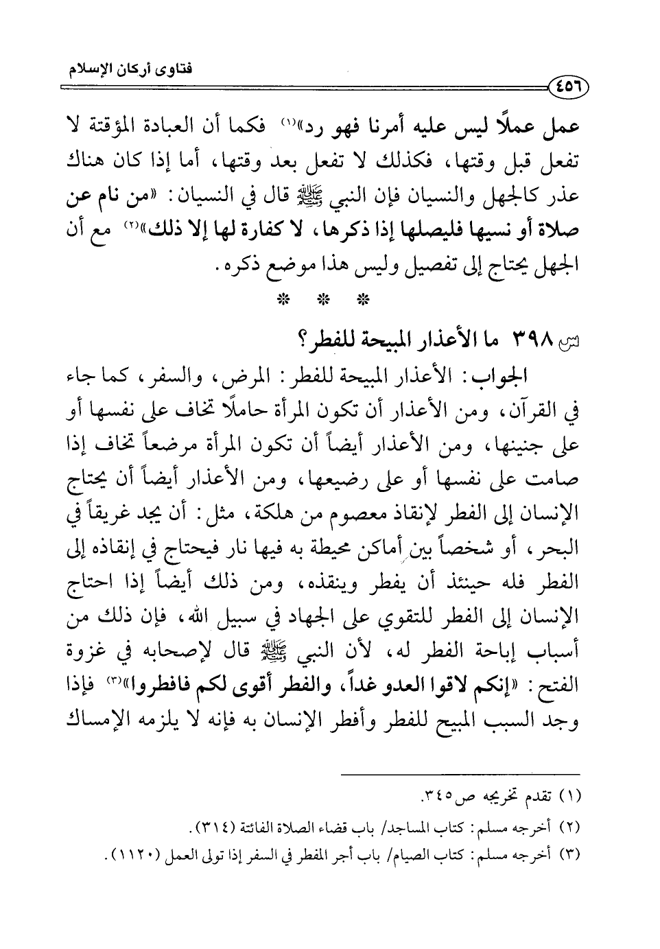 عمل عملاً ليس عليه أمرنا فهو رد)) (¬1) فكما أن العبادة المؤقتة لا تفعل قبل وقتها، فكذلك لا تفعل بعد وقتها، أما إذا كان هناك عذر كالجهل والنسيان فإن النبي صلى الله عليه وسلم قال في النسيان: " من نام عن صلاة أو نسيها فليصلها إذا ذكرها، لا كفارة لها إلا ذلك (¬2) مع أن الجهل يحتاج إلى تفصيل وليس هذا موضع ذكره.: هذا الرجل الذي ترك صيام شهر رمضان بحجة أنه يكتسب العيش له ولأولاده، وإذا كان فعل ذلك متأولاًً يظن