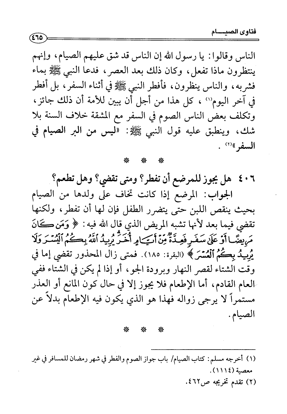 الناس وقالوا: يا رسول الله إن الناس قد شق عليهم الصيام، وأنهم ينتظرون ماذا تفعل، وكان ذلك بعد العصر، فدعا النبي صلى الله عليه وسلم بماء فشربه، والناس ينظرون، فأفطر النبي صلى الله عليه وسم في أثناء السفر، بل أفطر في آخر اليوم (¬1) ، وكل هذا من أجل أن يبين للأمة أن ذلك جائز، وتكلف بعض الناس الصوم في السفر مع المشقة خلاف السنة بلا شك، وينطبق عليه قول النبي صلى الله عليه وسلم: ((ليس من البر الصيام في السفر)) (¬2) .