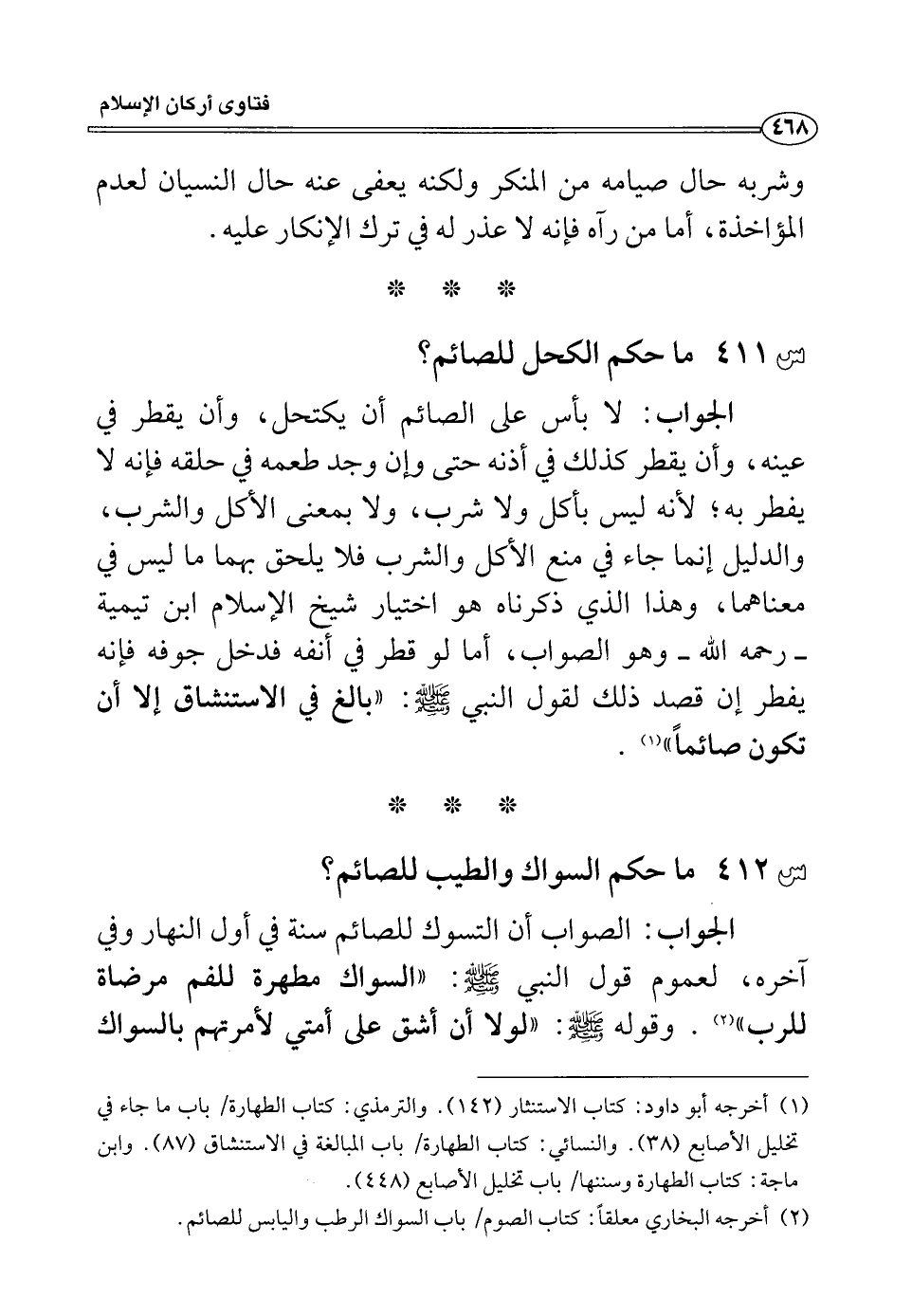 الجواب: الصواب أن التسوك للصائم سنة في أول النهار وفي آخره، لعموم قول النبي صلي الله عليه وسلم: ((السواك مطهرة للفم مرضاة للرب)) (¬2) . وقوله صلى الله عليه وسلم: ((لولا أن أشق على أمتي لأمرتهم بالسواك