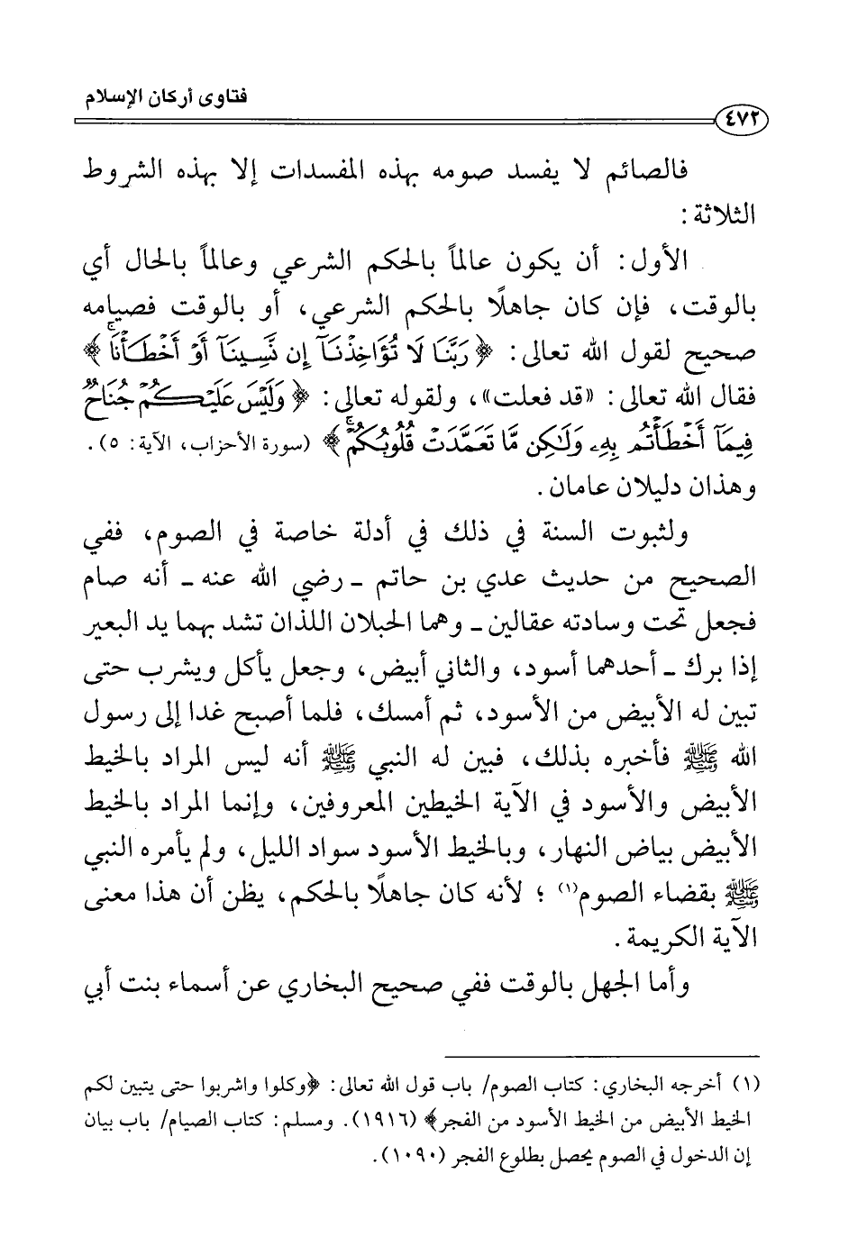 الأول: أن يكون عالماً بالحكم الشرعي وعالماً بالحال أي بالوقت، فإن كان جاهلاً بالحكم الشرعي، أو بالوقت فصيامه صحيح لقول الله تعالى (رَبَّنَا لا تُؤَاخِذْنَا إِنْ نَسِينَا أَوْ أَخْطَأْنَا) فقال الله تعالى: ((قد فعلت)) ولقوله تعالى: (وَلَيْسَ عَلَيْكُمْ جُنَاحٌ فِيمَا أَخْطَأْتُمْ بِهِ وَلَكِنْ مَا تَعَمَّدَتْ قُلُوبُكُمْ) (الأحزاب: الآية5) وهذان دليلان عامان.