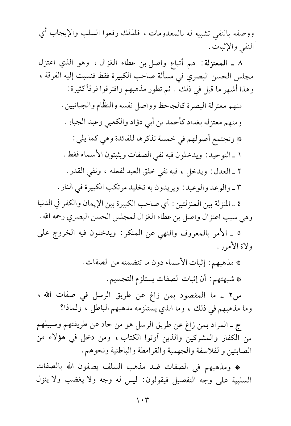 س2 ـ ما المقصود بمن زاغ عن طريق الرسل في صفات الله، وما مذهبهم في ذلك، وما الذي يستلزمه مذهبهم الباطل، ولماذا؟