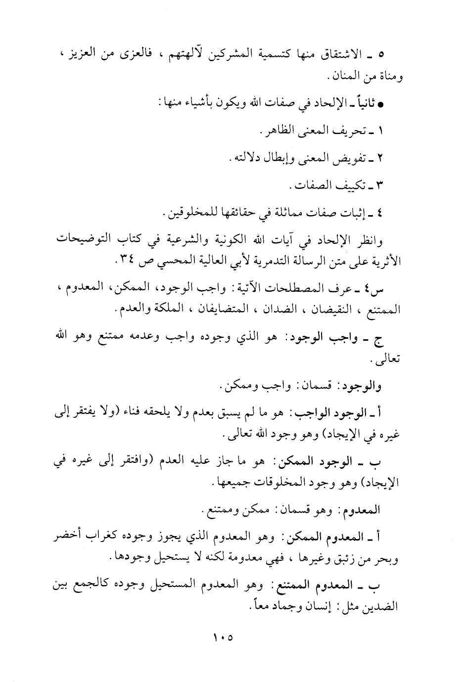 س4 ـ عرّف المصطلحات الآتية: واجب الوجود، الممكن، المعدوم، الممتنع، النقيضان، الضدان، المتضايفان، الملكة والعدم.