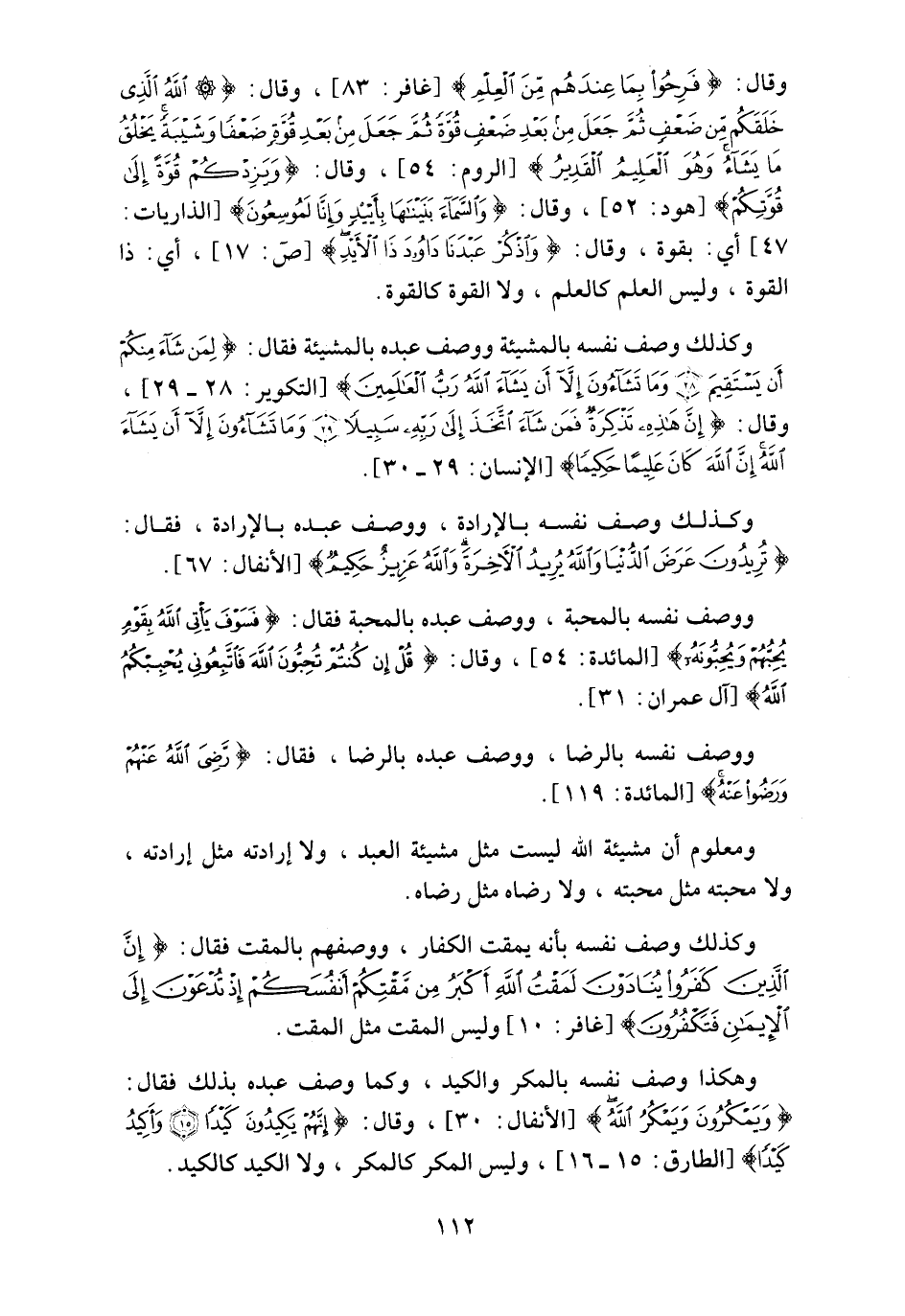 ووصف نفسه بالرضا، ووصف عبده بالرضا، فقال: {رَضِيَ اللَّهُ عَنْهُمْ وَرَضُوا عَنْهُ} [المائدة: 119] . ومعلوم أن مشيئة الله ليست مثل مشيئة العبد، ولا إرادته مثل إرادته، ولا محبته مثل محبته، ولا رضاه مثل رضاه.