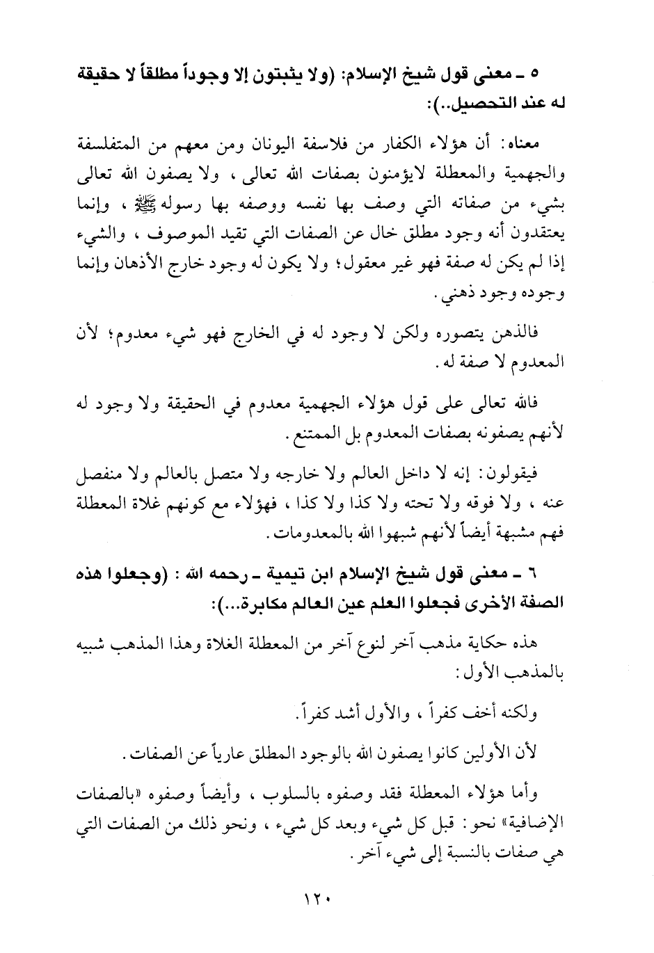 5 ـ معنى قول شيخ الإسلام: "ولا يثبتون إلا وجوداً مطلقاً لا حقيقة له عند التحصيل..":