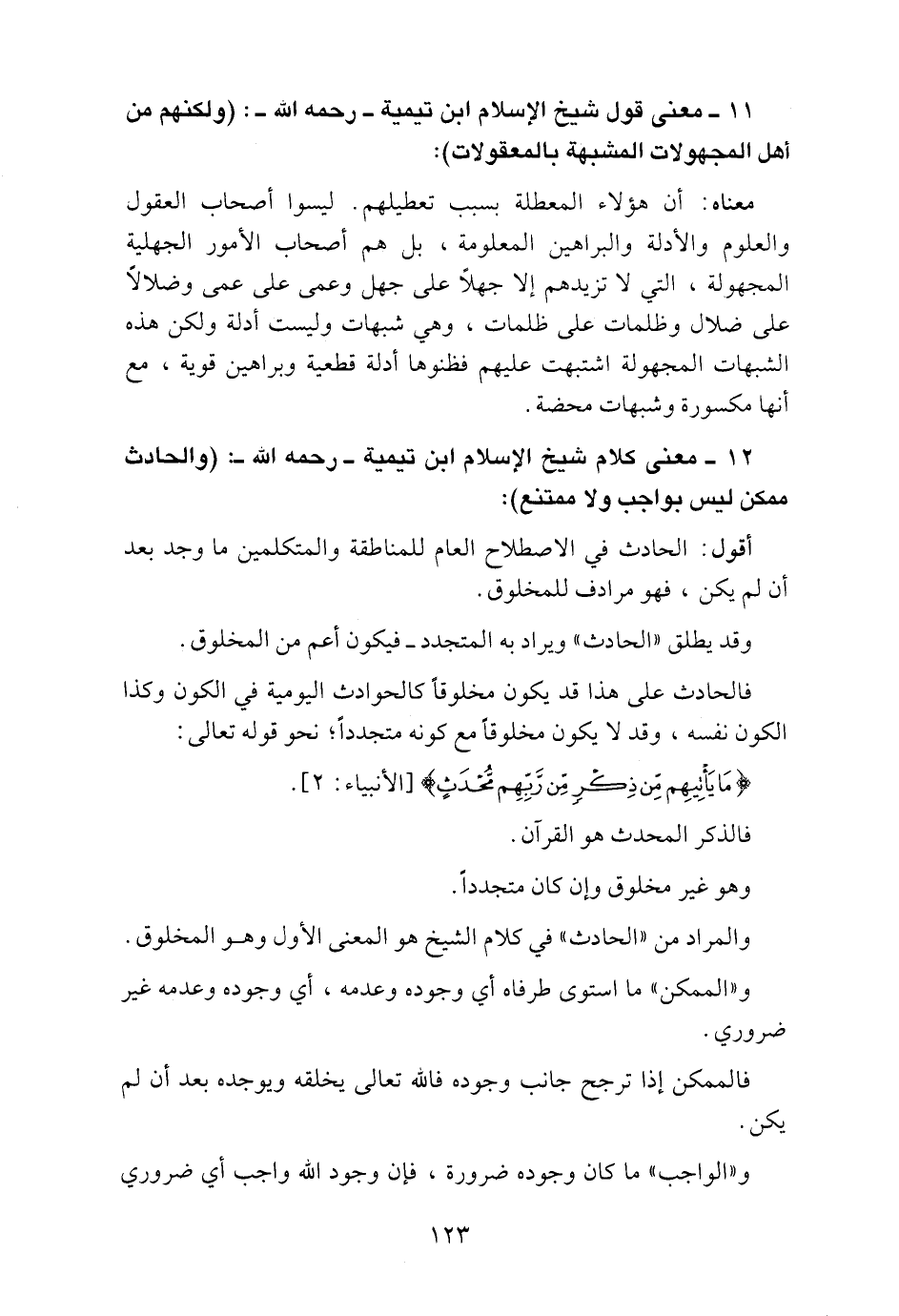 12 ـ معنى كلام شيخ الإسلام ابن تيمية ـ رحمه الله ـ "والحادث ممكن ليس بواجب ولا ممتنع":