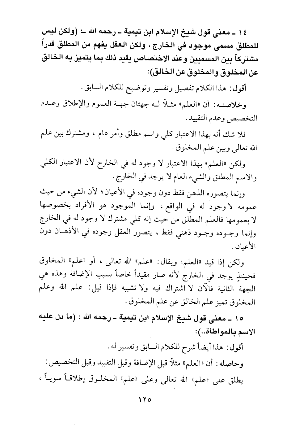 14 ـ معنى قول شيخ الإسلام ابن تيمية ـ رحمه الله ـ "ولكن ليس للمطلق مسمى موجود في الخارج، ولكن العقل يفهم من المطلق قدراً مشتركاً بين المسميين وعند الاختصاص يقيد ذلك بما يتميز به الخالق عن المخلوق والمخلوق عن الخالق":